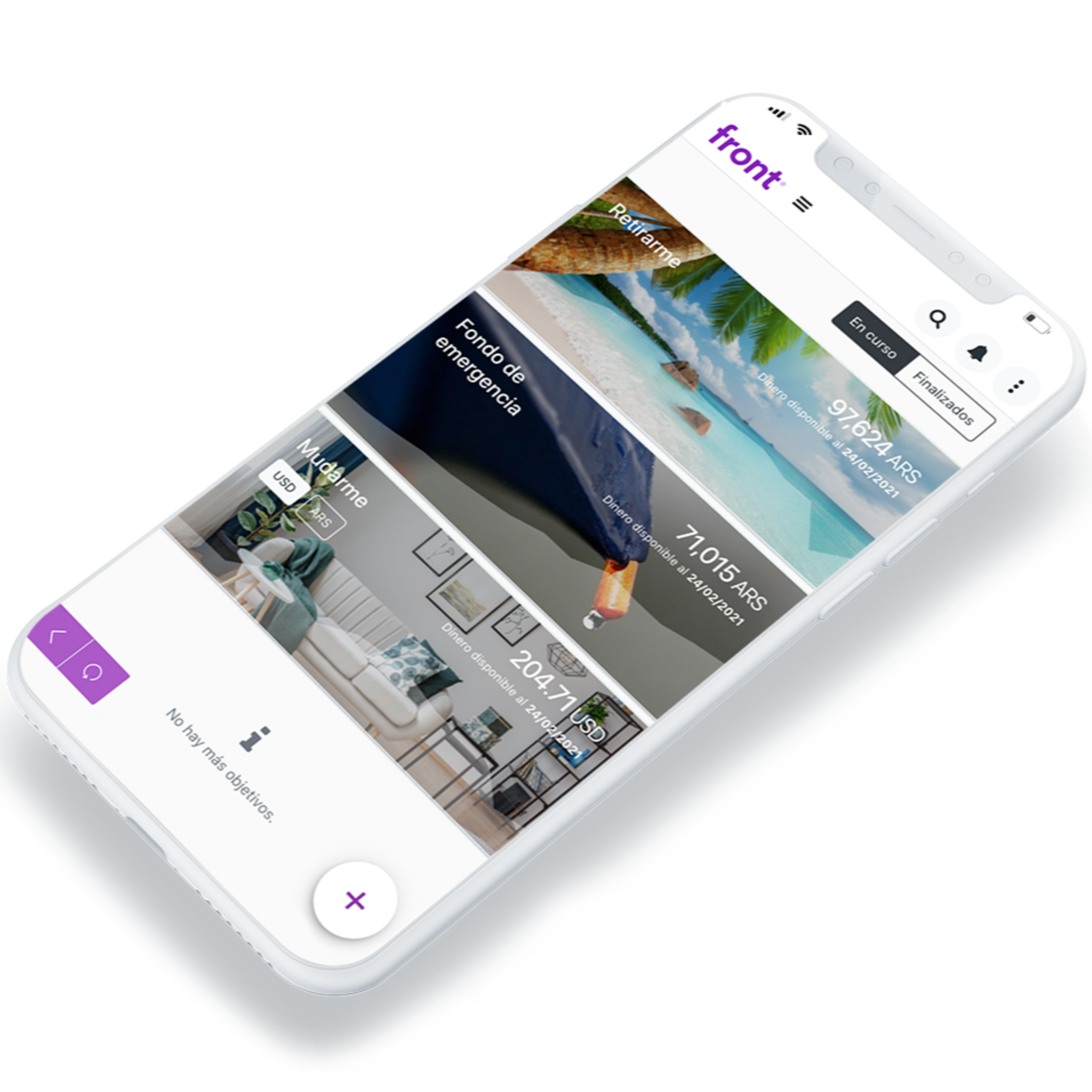 Conformado por un gran equipo de economistas, ingenieros y diseñadores, Front llegó para simplificar la manera de ahorrar. Es muy fácil. Creas objetivos personales y, a medida que vayas ahorrando en ellos, Front te va a ir ayudando a invertirlos para protegerlos de la inflación.