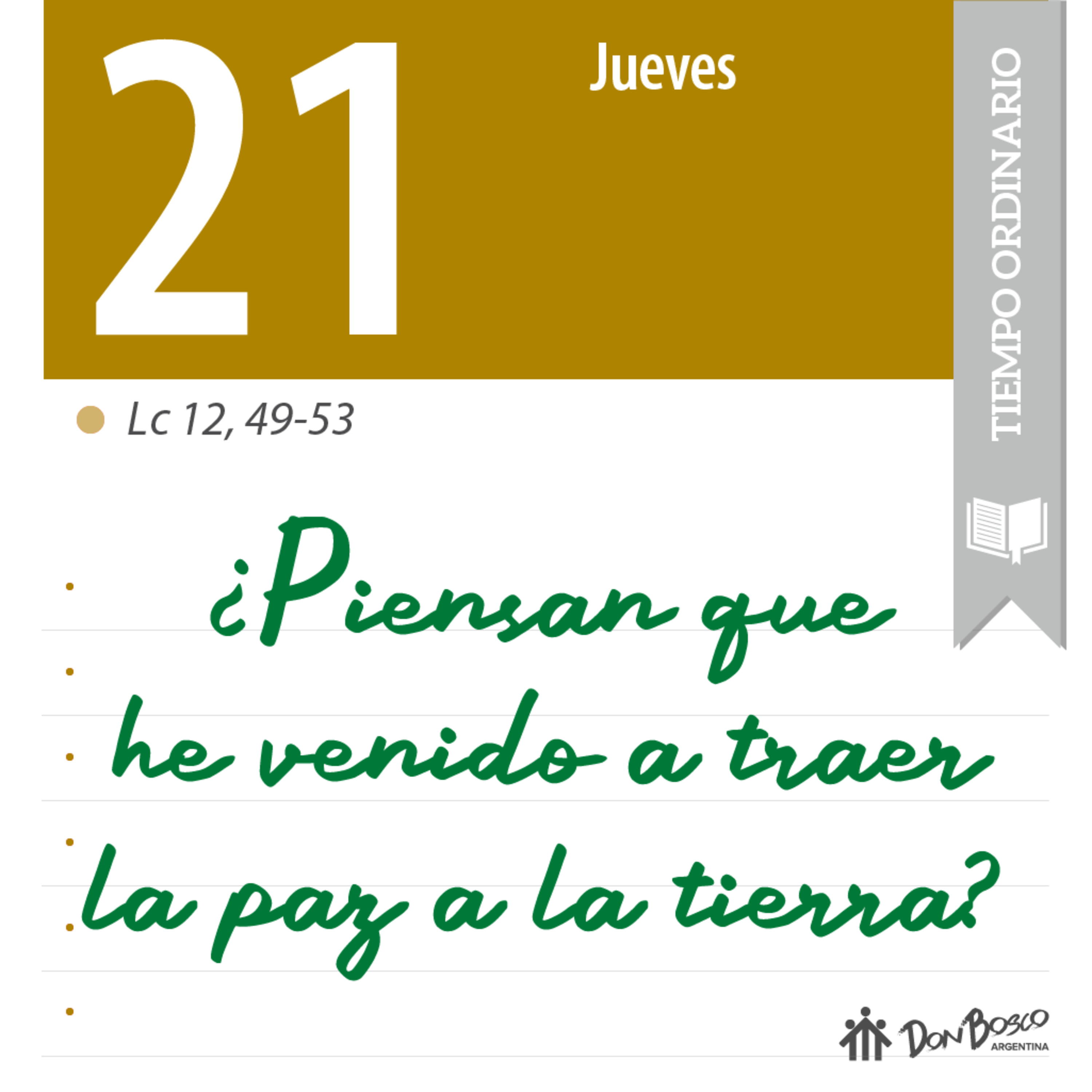 Comentario con reflexión salesiana del Evangelio Lc. 12, 49-53 - "¿Piensan que he venido a traer la paz a la tierra?"