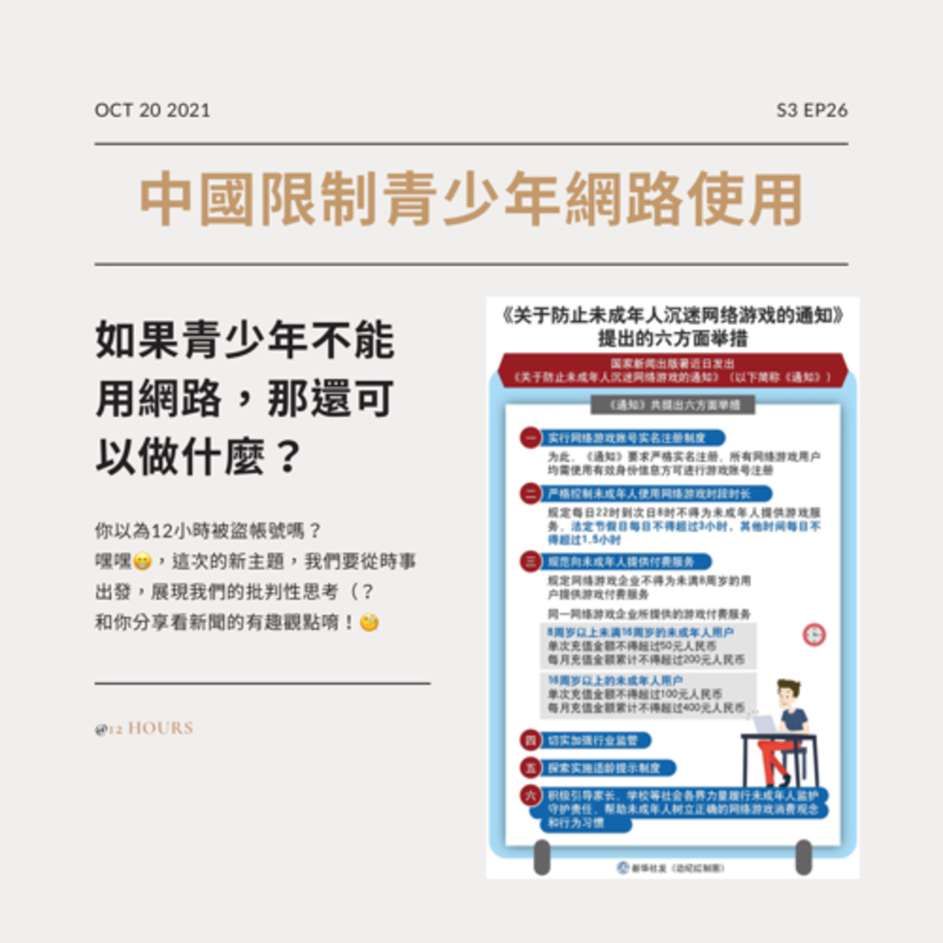 我們的新單元是藉由時事新聞來延伸討論議題,聽起來好像題目變得又大又硬,但不用擔心!!! 12小時成員還是會秉持著不搞笑無寧死的想法,用輕鬆活潑的方式來聊的。