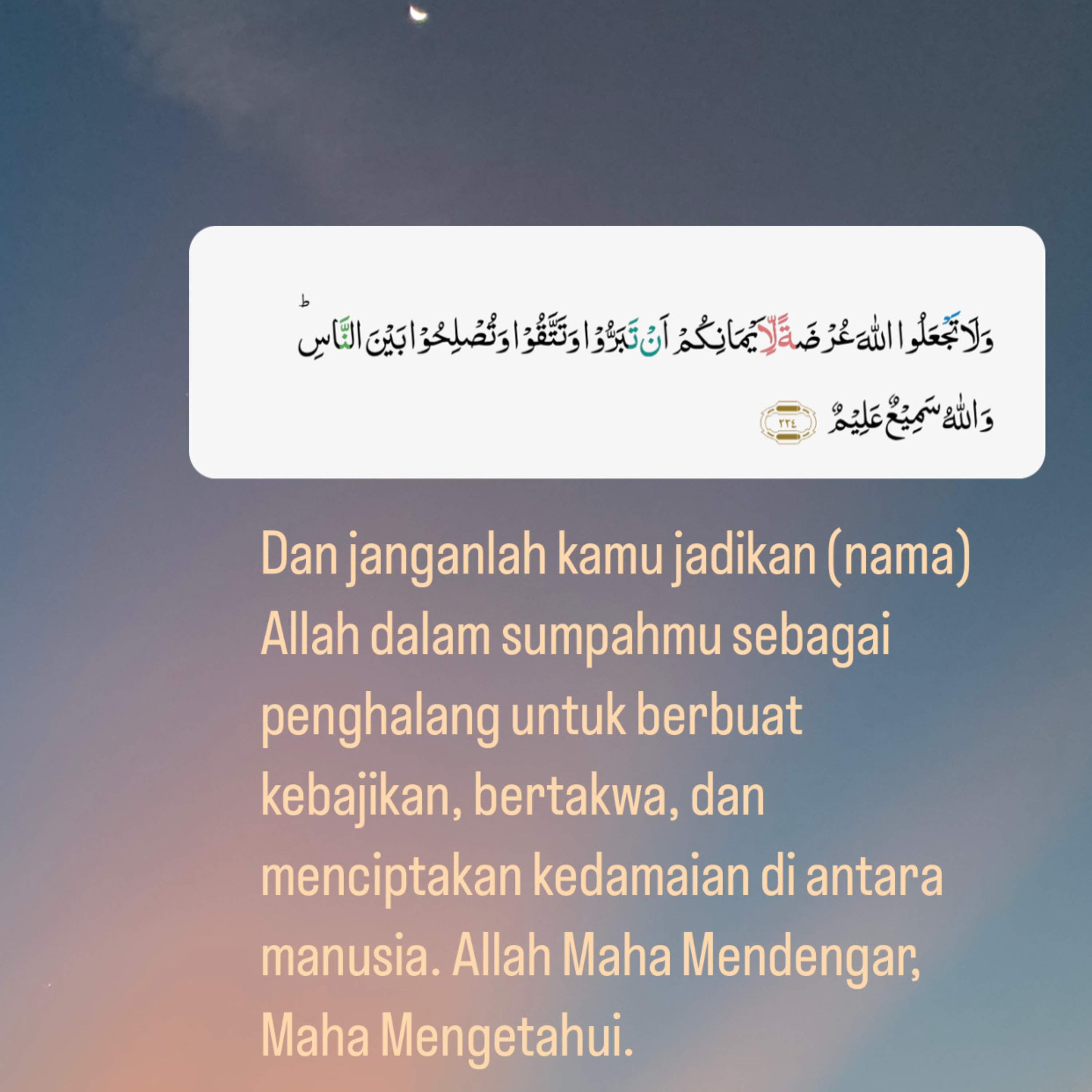 Dan janganlah kamu jadikan (nama) Allah dalam sumpahmu sebagai penghalang untuk berbuat kebajikan, bertakwa, dan menciptakan kedamaian di antara manusia.