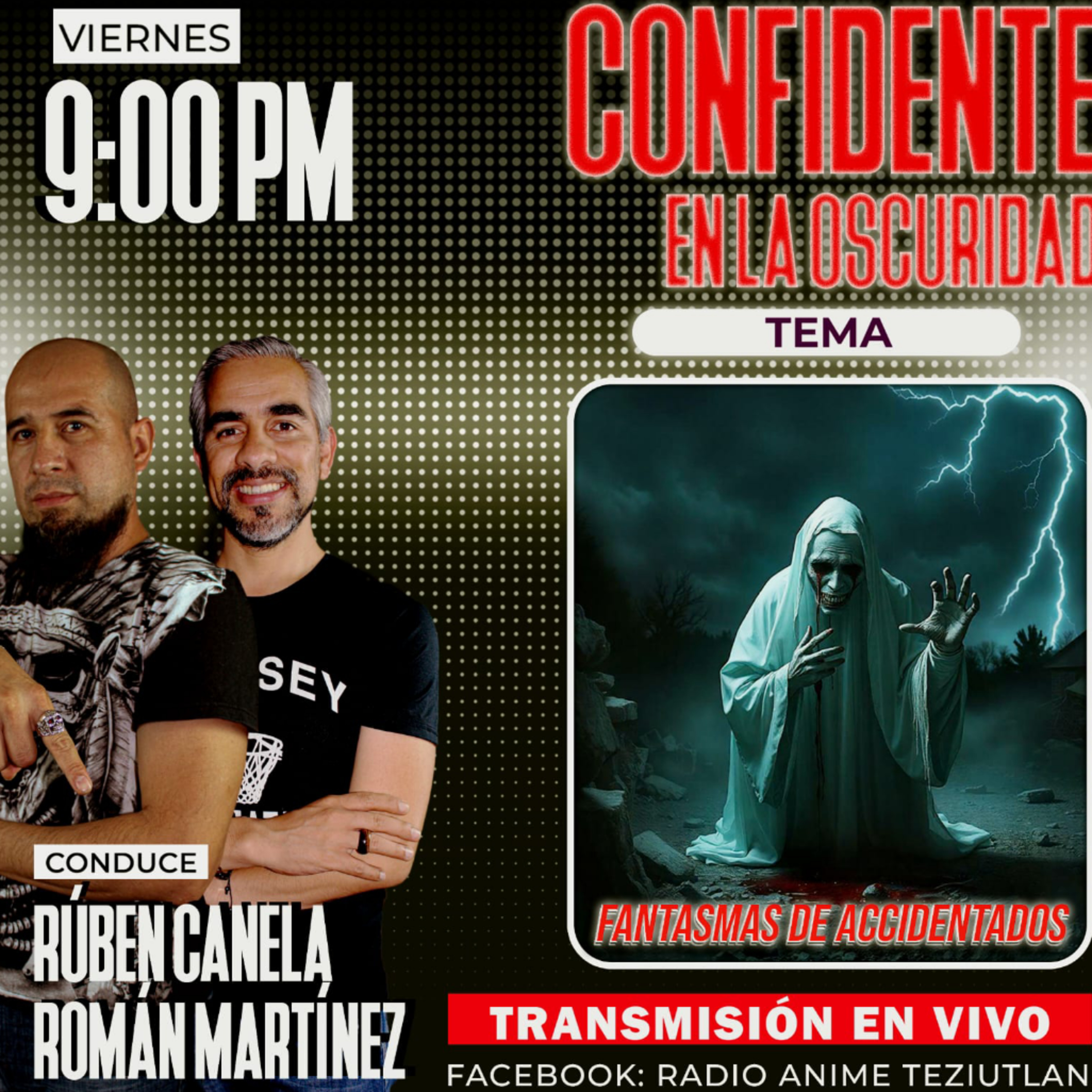 Confidente en la oscuridad Confidente en la Oscuridad Oficial transmitido en Facebook Live a través de Radio Anime Teziutlán y en los medios digitales de **Pequeño Juan** y **Expoo Life & Style**... bajo la conducción de **Rubén Canela** y **Román Martínez** hablarán de un tema que pondrá tu piel de gallina: **Fantamas de Accidentados** 👻🚑.