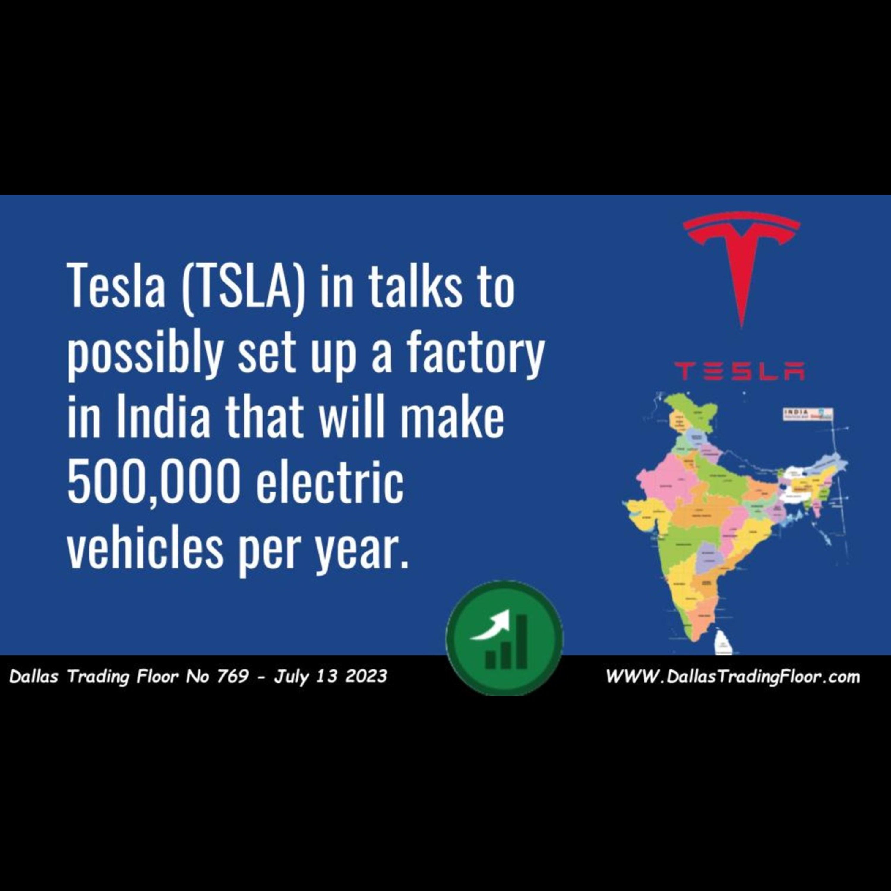 Tesla (TSLA) in talks to possibly set up a factory in India that will make 500,000 electric vehicles per year.