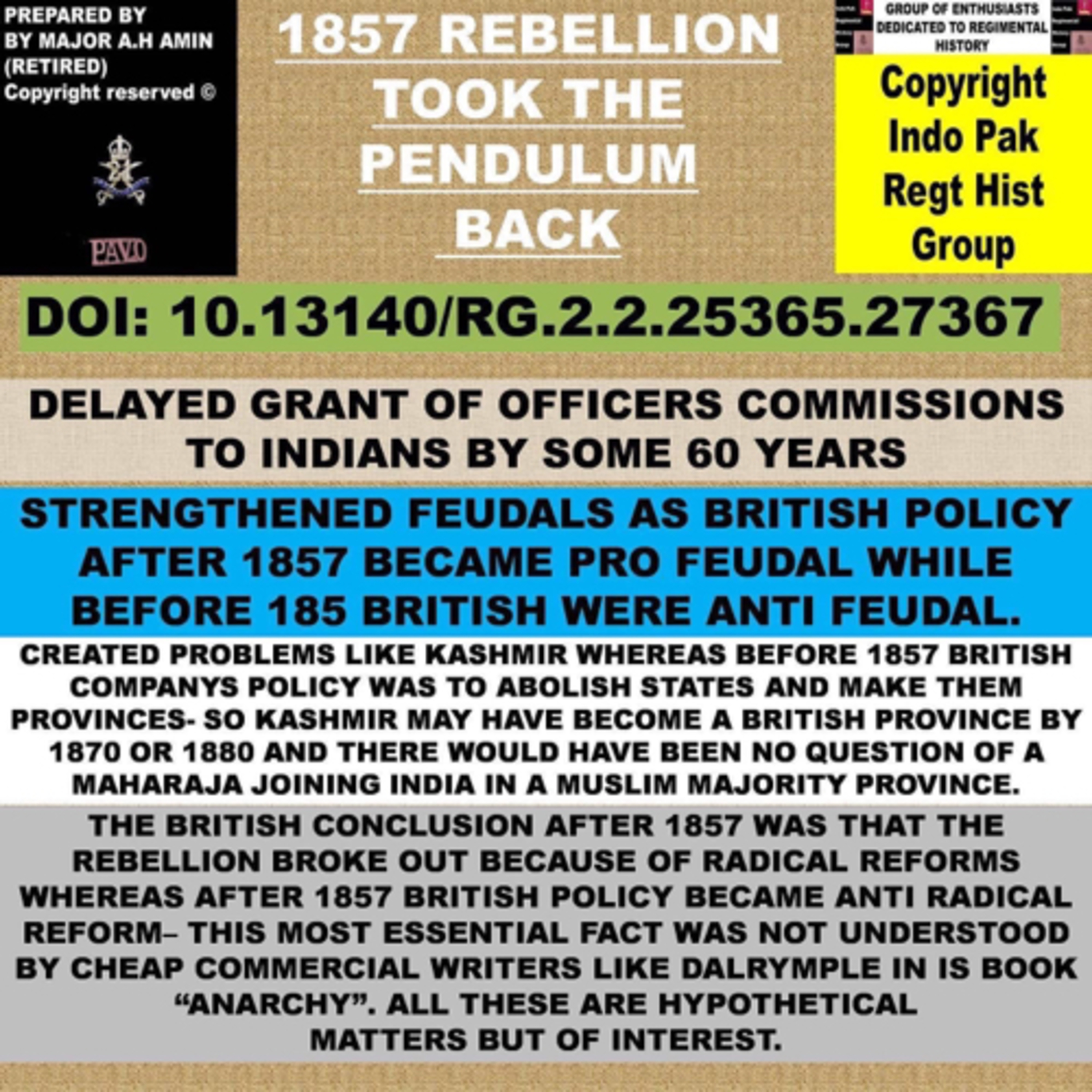British East India Company officers were a forward thinking and open minded lot-The Problem of discrimination was squarely linked to British state policies-Major A.H Amin (Retired) So while Major General Outram no connection to British Army originally recommended Indians for Victoria Cross as Early as 1856 , British states chauvinistic policies denied it This is where Dalrymple is seriously at fault ! The British East India Company was a social reformer and progressive entity but the British government that took over India in 1857 was a REGRESSIVE entity. Fear of 1857 led to these REGRESSIVE POLICIES SOME WILL SAY. A BIG NO. Even before 1857 British government was REGRESSIVE and BIASED and a big proof was in denying Indians 1857. So there were two kinds of Britishers.Those from the company belonging to relatively middle class families were highly progressive people like General Outram etc. The British Army officers were by and large more biased as they came from the higher classes who bought commissions at least until Cardigan abolished the malpractice ! So when 3 rd Bombay Cavalry performed outstandingly Major General Outram recommended not only British-THE #BRITISH CONCLUSION AFTER 1857 WAS THAT THE #REBELLION BROKE OUT BECAUSE OF #RADICAL #REFORMS WHEREAS AFTER 1857 BRITISH #POLICY BECAME ANTI RADICAL REFORM– THIS MOST ESSENTIAL FACT WAS NOT UNDERSTOOD BY #CHEAP COMMERCIAL WRITERS LIKE #DALRYMPLE IN HIS BOOK “ANARCHY”. ALL THESE ARE #HYPOTHETICAL MATTERS BUT OF INTEREST.