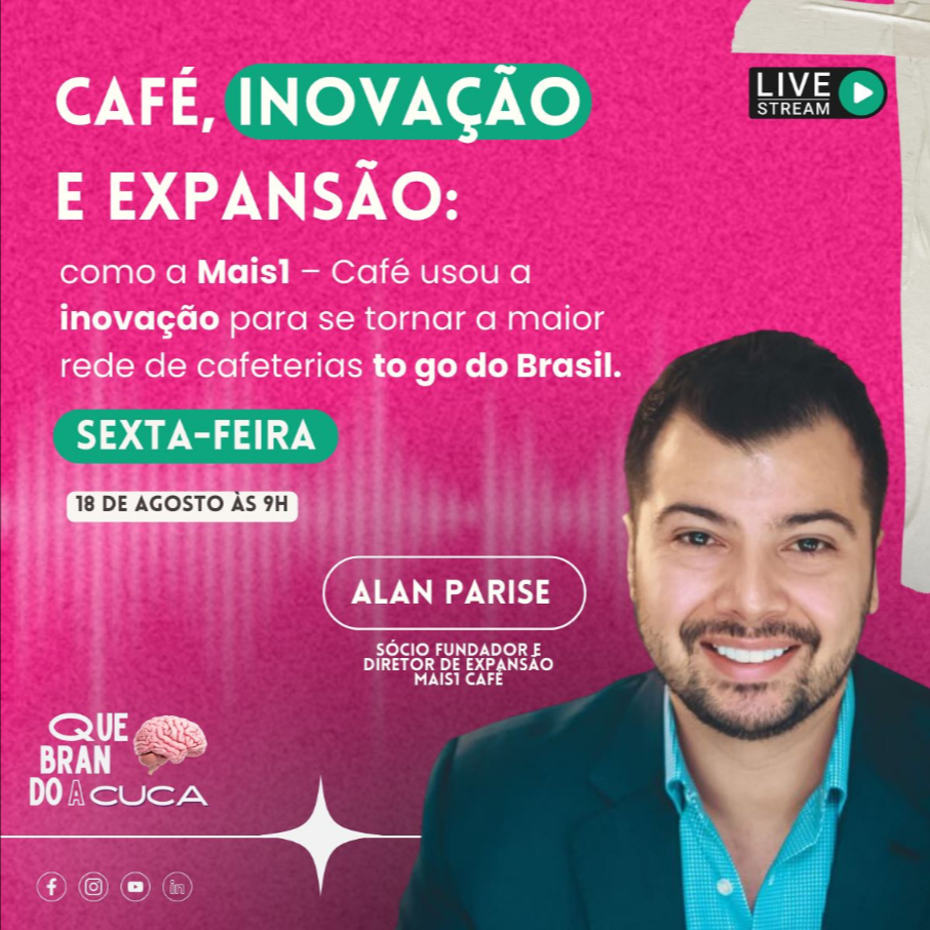 Conheça nosso convidado para o "Quebrando a Cuca" desta sexta-feira, 18 de agosto. @alanparise , um apaixonado por vendas e expert com mais de 15 anos de experiência, compartilhará sua jornada. Desde a fundação da PDMG, empresa formatadora de franquias, até o sucesso estrondoso da Mais1 Café, que se tornou a maior rede de cafeterias to go do Brasil em apenas 3 anos! 🚀☕