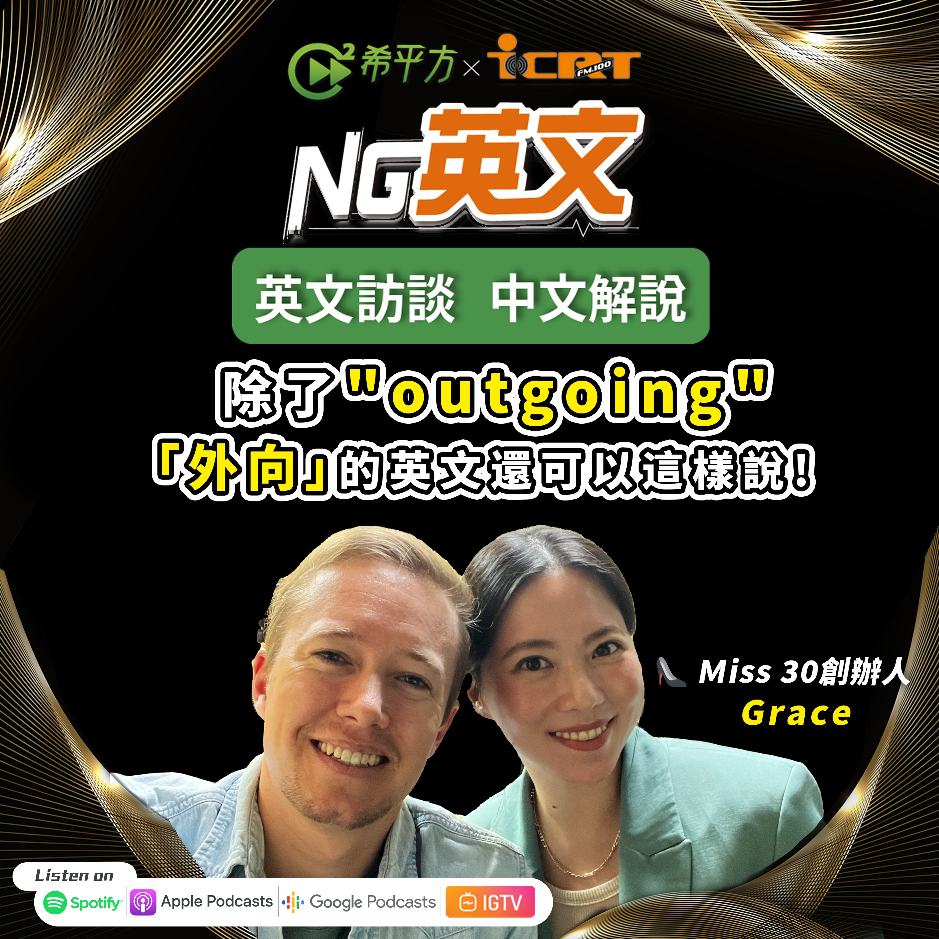 本集的NG英文邀請到目前在Miss 30負責公關與行銷的Grace Lee,Grace和上週來賓Vanessa是朋友唷!他們為了提供身邊的傑出女性一個發光發熱的舞台,兩年前共同創辦Miss 30,她在節目中也特別強調「自我」的重要性,除此之外,本集NG英文也會帶你一起挖掘Grace學習英文的小撇步唷~(提示:這個方法大家都做得到!)對行銷和公關工作有興趣,或是想把英文學好的你,千萬不要錯過這集NG英文!