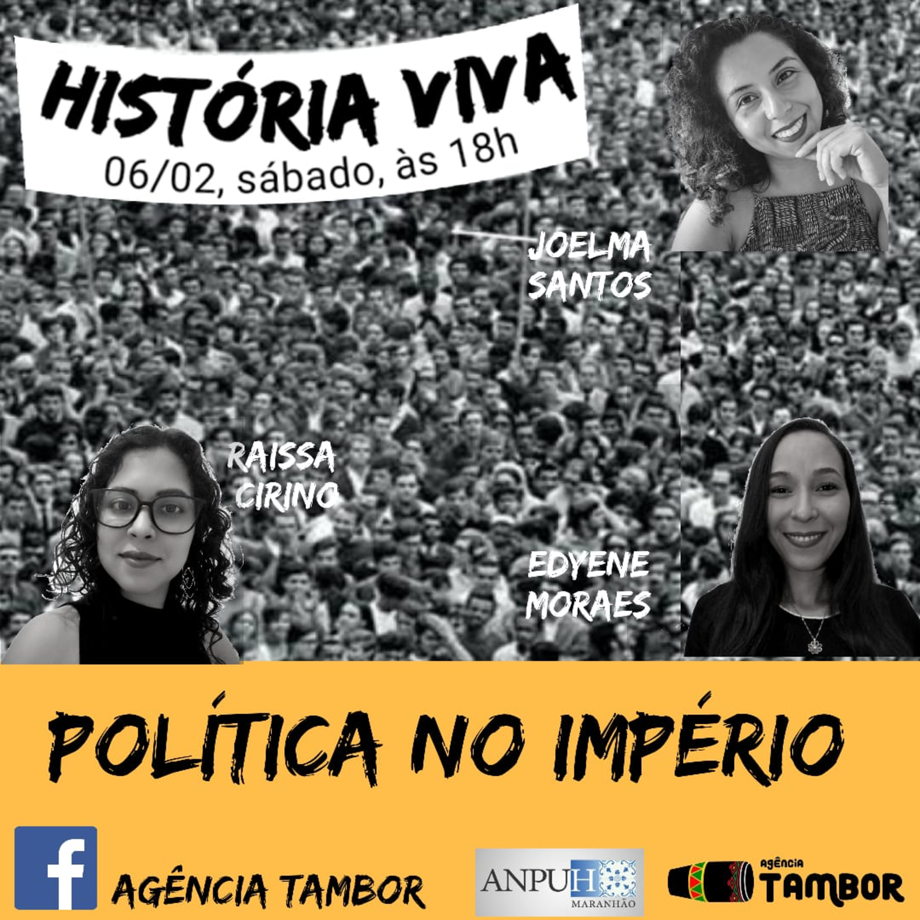 O programa História Viva deste sábado, dia 06 de fevereiro, abordará o tema Política no Império. Contaremos com a presença do professora Dra. Raíssa Cirino, entrevistando a professora Ma. Edyene Moraes, Primeira Tesoureira da atual direção da ANPUH-MA.