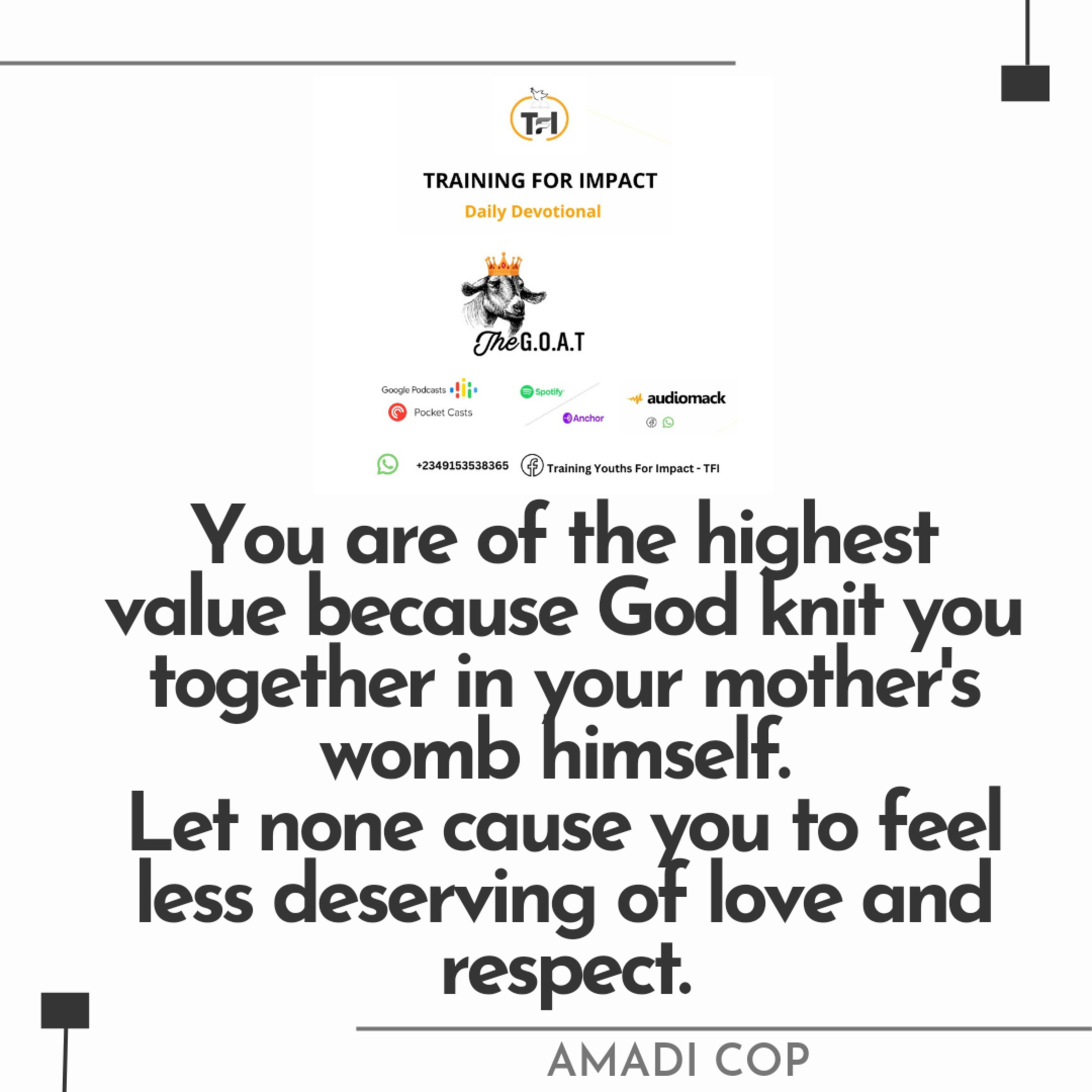 You are of the highest value because God knit you together in your mother's womb himself. Do not allow anyone make you feel less deserving of love and respect.