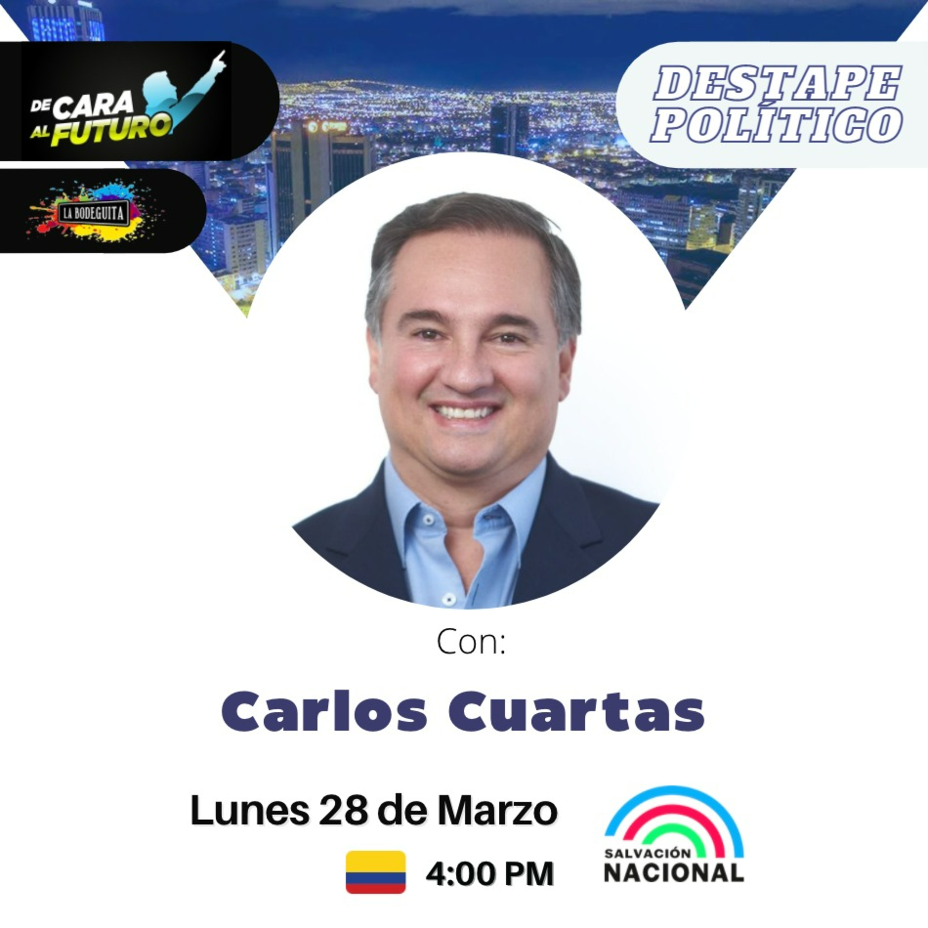 Los jóvenes de De Cara Al Futuro conversan con Carlos Cuartas, quien es Profesional en Administración de Empresas de la Universidad Eafit y Magíster en Administración de Empresas de la Universidad de Barcelona, con especialización en Negocios Internacionales. Cuartas quiere llegar a la Vicepresidencia con el legado del líder conservador Álvaro Gómez Hurtado y el objetivo de reformar la justicia, restaurar la moralidad en la política, acabar con la impunidad y la corrupción.