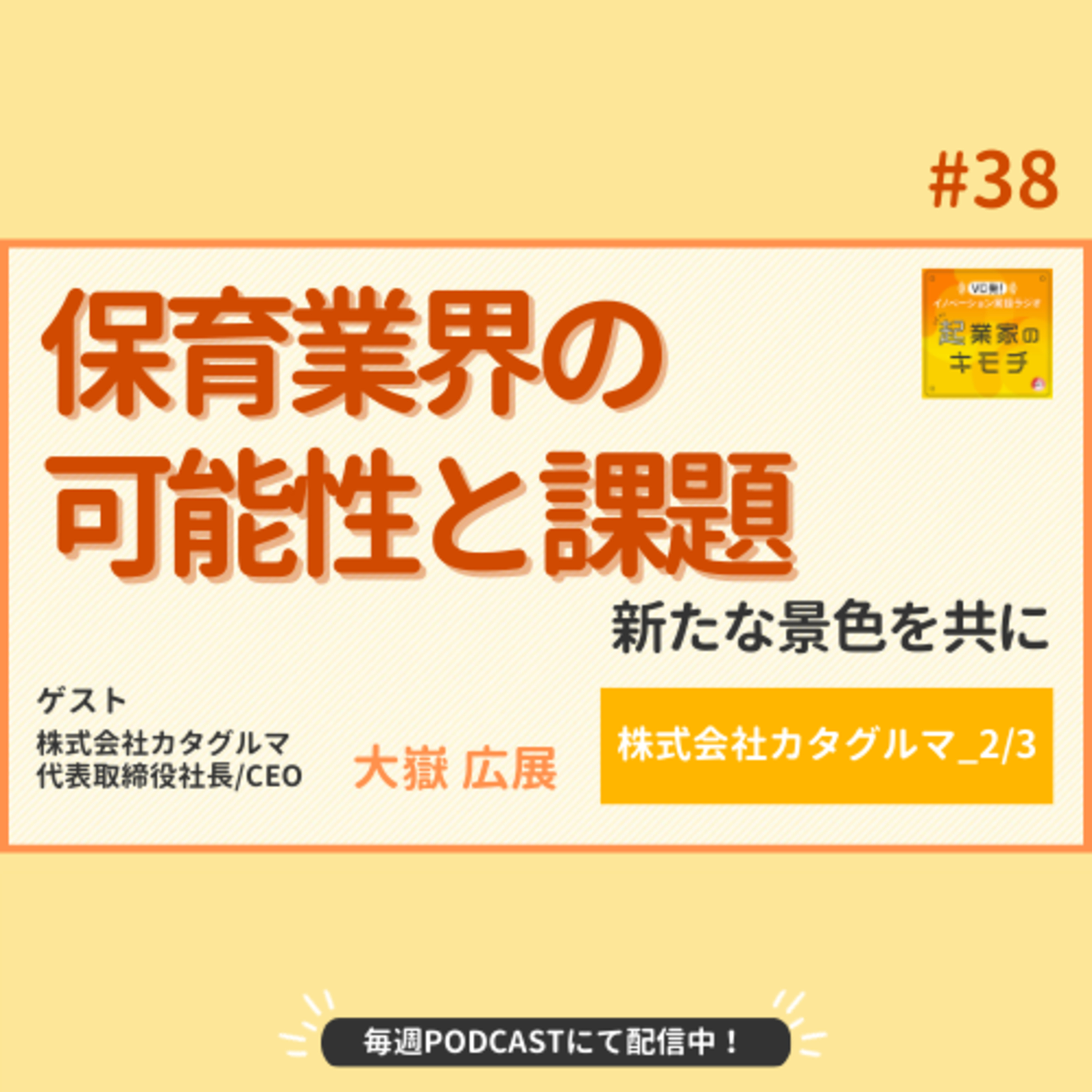 引き続き、株式会社カタグルマの代表大嶽さんをゲストにお迎えしてお届け。2週目となる今週は、事業立ち上げ時のお話や、顧客である保育の現場に焦点を当てて深掘りしていきます。前職の知見を活かして、最初から好発進が切れたというあるPR方法、そして反対に思わぬ失敗だった事とは?