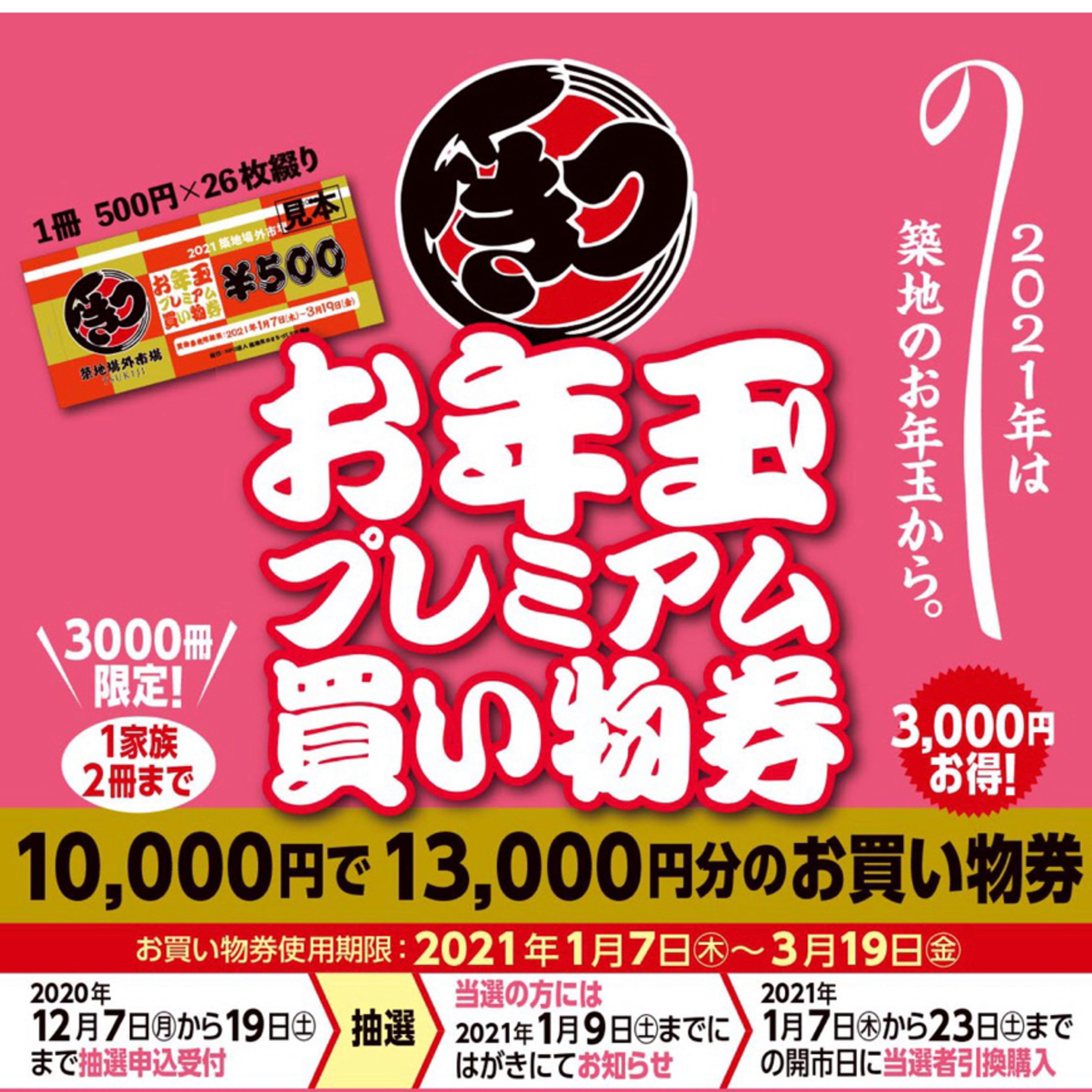 築地場外市場で3000円得するチャンスです。築地でお買い物やお食事される方!サックと申込だけ済ませましょう!!当たるといいですね。