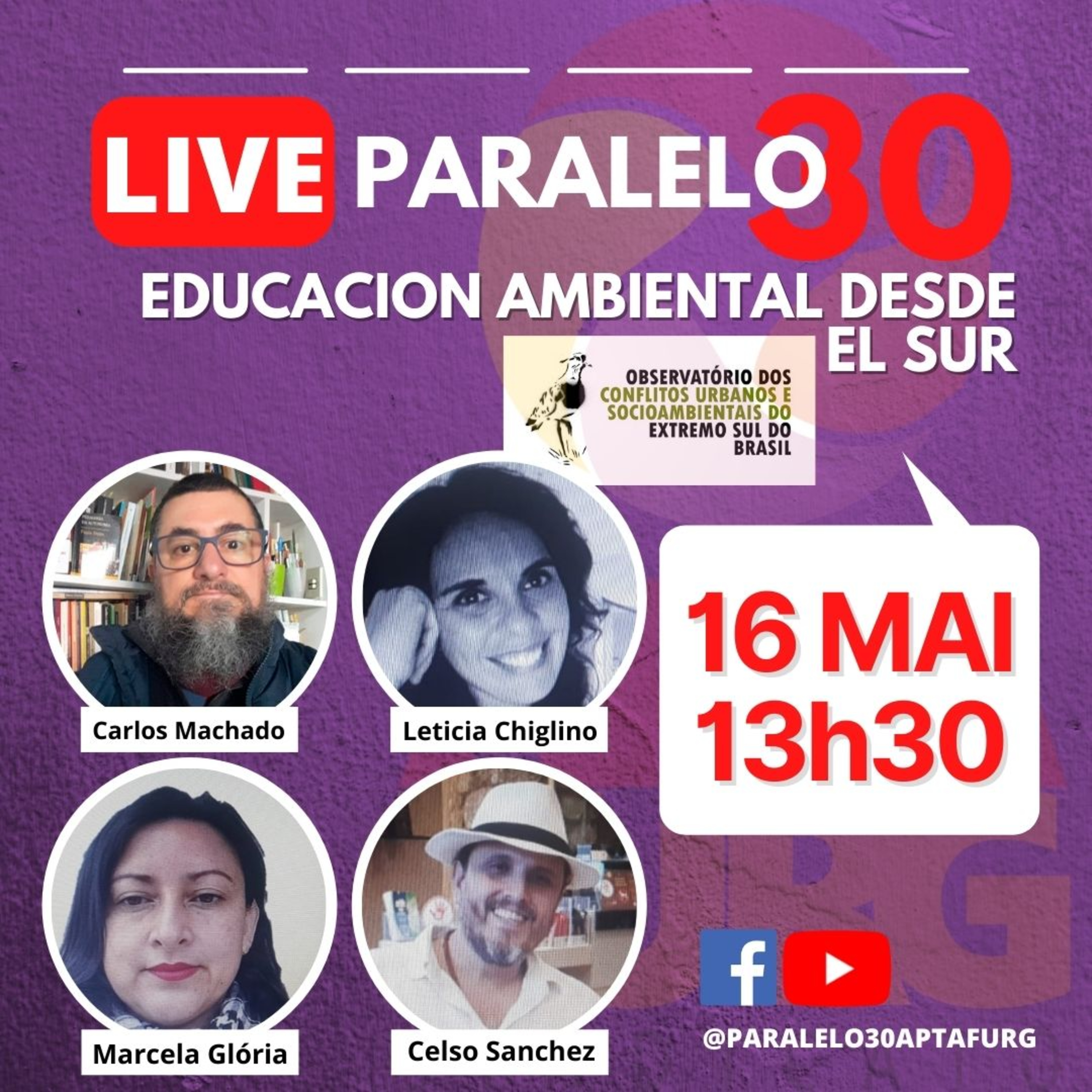 No Paralelo30 desta segunda-feira, 16 de maio, teremos mais uma edição em parceria com o Observatório dos Conflitos do Extremo Sul do Brasil. Neste encontro, o tema sugerido é: "Educación Ambiental Desde El Sur" parte 1. Para esta conversa, receberemos: Carlos Machado (FURG - Brasil), Celso Sanchez (UNIRIO - Brasil), Leticia Chiglino (Universidad de la Republica - Cure) e Marcela Glória (Universidad Tolima - Colômbia). Não perde! Vem com a gente nos canais do @paralelo30aptafurg no facebook e youtube às 13h30! Apoio cultural da APTAFURG Sindicato.