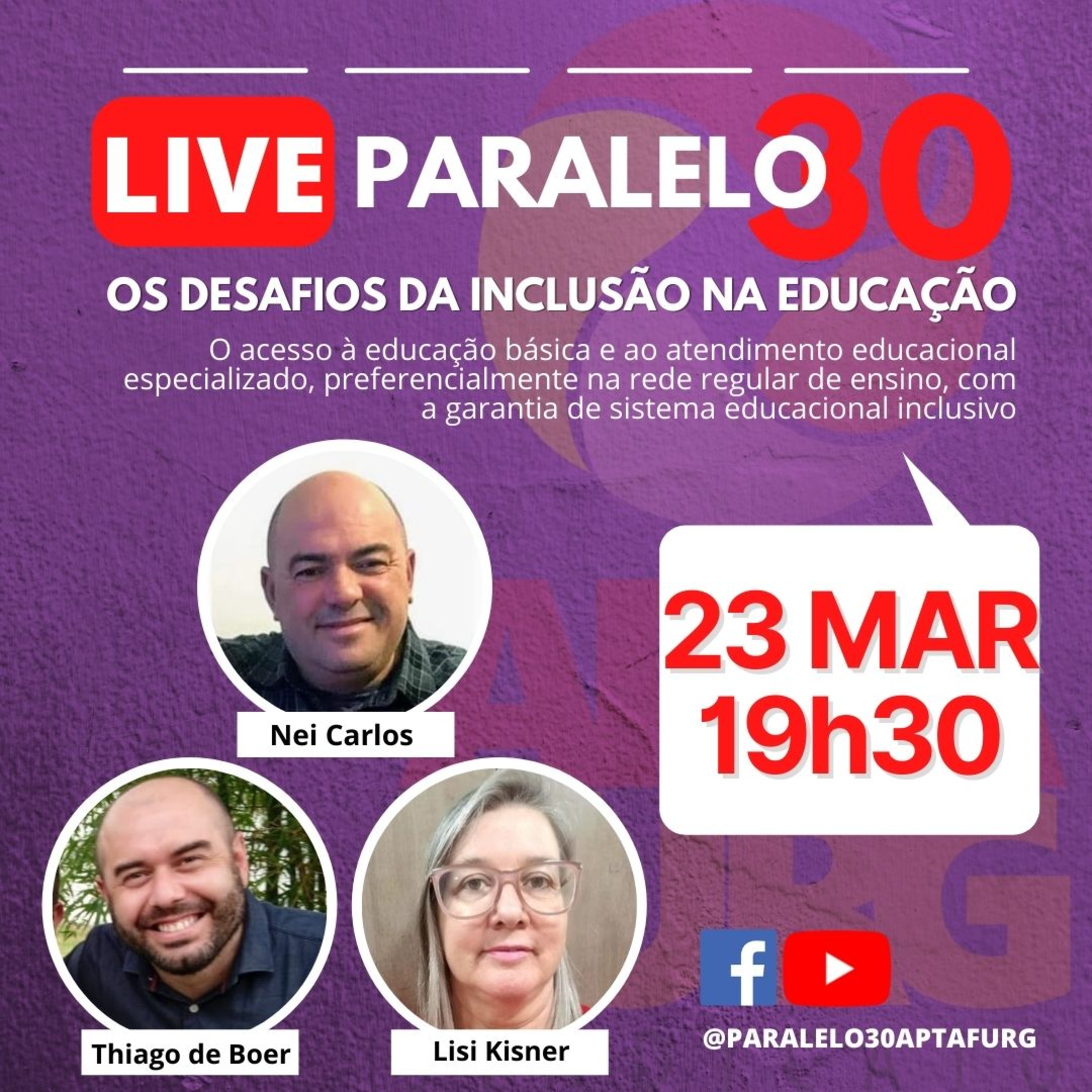 No Paralelo30 desta quarta-feira, 23 de março, nosso papo é sobre os desafios da inclusão na educação. Breve histórico: Desde os anos 60 se discute no Brasil a inclusão na educação e os direitos das pessoas com deficiência, transtornos globais do desenvolvimento e altas habilidades ou superdotação. A primeira lei data de 1961, passando por diversas atualizações ao longo do tempo. "Além do Estatuto da Pessoa com Deficiência, do PNE, da BNCC, existem decretos, portarias, resoluções, notas técnicas e leis que dispõem sobre o assunto, que refletem a evolução ou retrocesso na discussão de inclusão das diversidades e sua integração social". Nossa constituição federal, data de 1988, afirma “a Educação como um direito de todos, garantindo o pleno desenvolvimento da pessoa, o exercício da cidadania e a qualificação para o trabalho” e “a igualdade de condições de acesso e permanência na escola”. A Lei Nº 8.069 de 1990 - Estatuto da Criança e do Adolescente - reafirma esse direito e ainda define a "prioridade de atendimento nas ações e políticas públicas de prevenção e proteção para famílias com crianças e adolescentes nessa condição". Em 2014 o Plano Nacional de Educação (PNE) foi revisto e atualizado para o decênio (2014/2024) trazendo como meta: “Universalizar, para a população de 4 a 17 anos com deficiência, transtornos globais do desenvolvimento e altas habilidades ou superdotação, o acesso à educação básica e ao atendimento educacional especializado, preferencialmente na rede regular de ensino, com a garantia de sistema educacional inclusivo, de salas de recursos multifuncionais, classes, escolas ou serviços especializados, públicos ou conveniados”. [Com informações do portal: Todos pela Educação] Para esse papo receberemos: Lisi Kisner - Professora da Rede Municipal há 20 anos. Atua, desde 2020, na Coordenação do SINTERG e no Conselho Municipal de Educação. Thiago Bueno de Boer, advogado, graduando em psicologia, acompanhante terapeutico. Nei Carlos Antônio Rodrigues. Pai de autista e ex presidente da Amar Vem com a gente! A live acontece às 19h30, em transmissão simultânea pelo face e youtube @paralelo30aptafurg Paralelo30, um espaço para debater e expressar opiniões! Apoio cultural APTAFURG sindicato