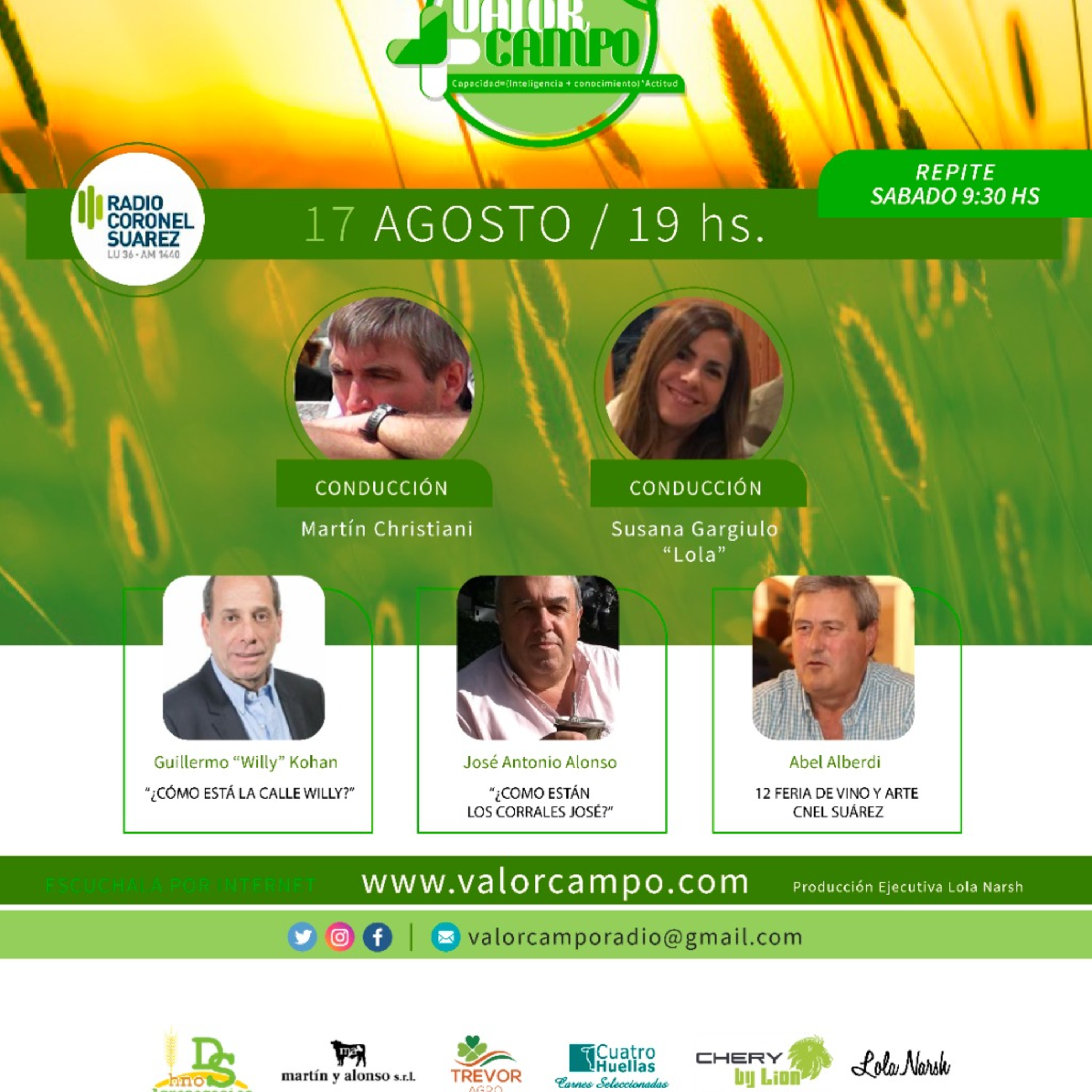 José Alonso y a situación de la ganadería y los mercados. Con Willy Kohan recorremos su vida periodistica y la coyuntura política actual. Con Abel Alberdi hablamos sobre el Evento Feria de Vinos y Artes en Coronel Suarez.