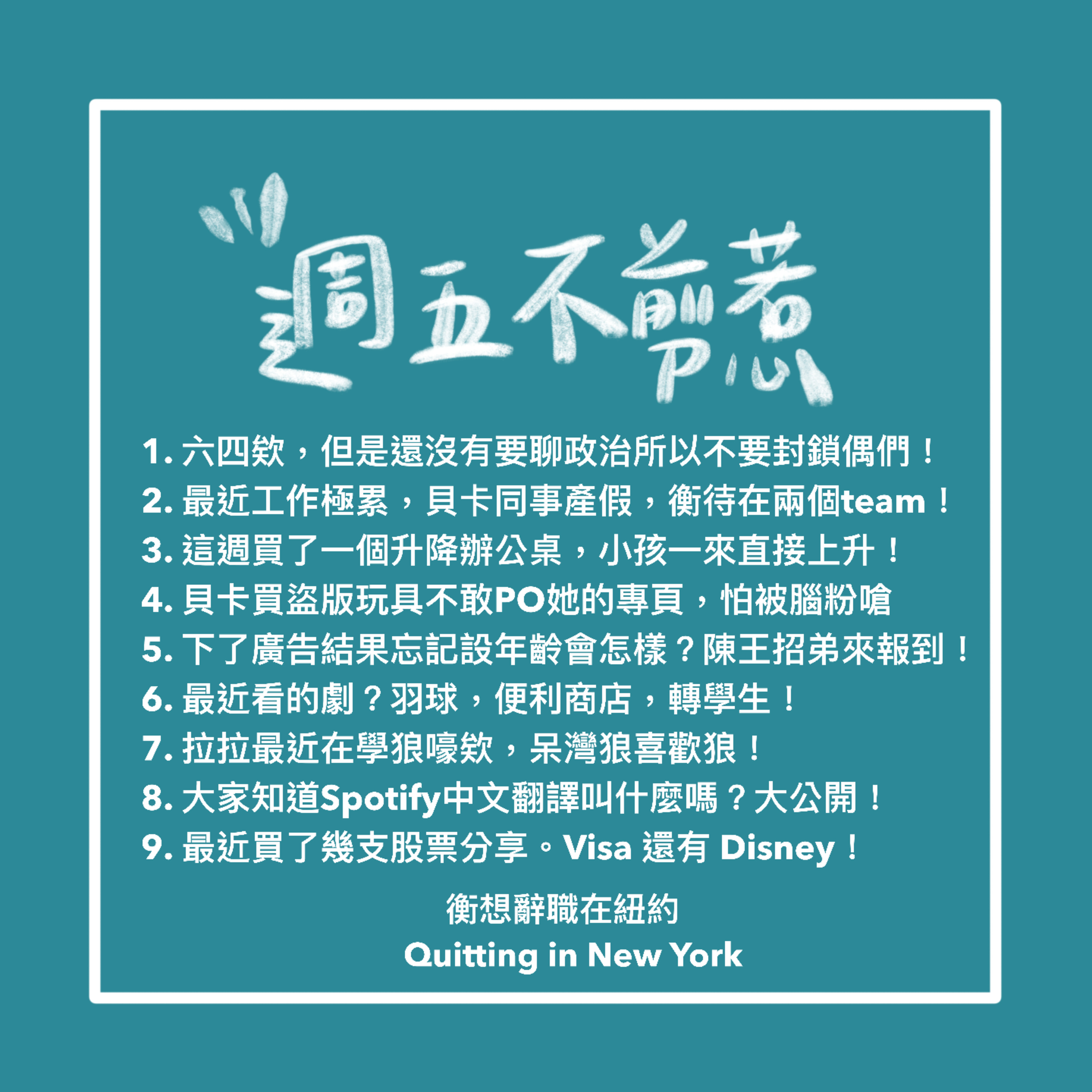 #衡想辭職在紐約 #辭職 #紐約 #Quitting_In_New_York #QINY #新企劃 #新單元 #週五 #不剪惹 #時事 #碎碎念 #買東西 #升降桌 #玩具 #磁鐵 #拼圖 #盜版 #臉書 #廣告 #年齡層 #陳王招弟 #政治留言 #齁 #股癌 #美劇 #排球少年團 #kimsconvenience #轉學來的學生 #美股 #spotify #狼嚎