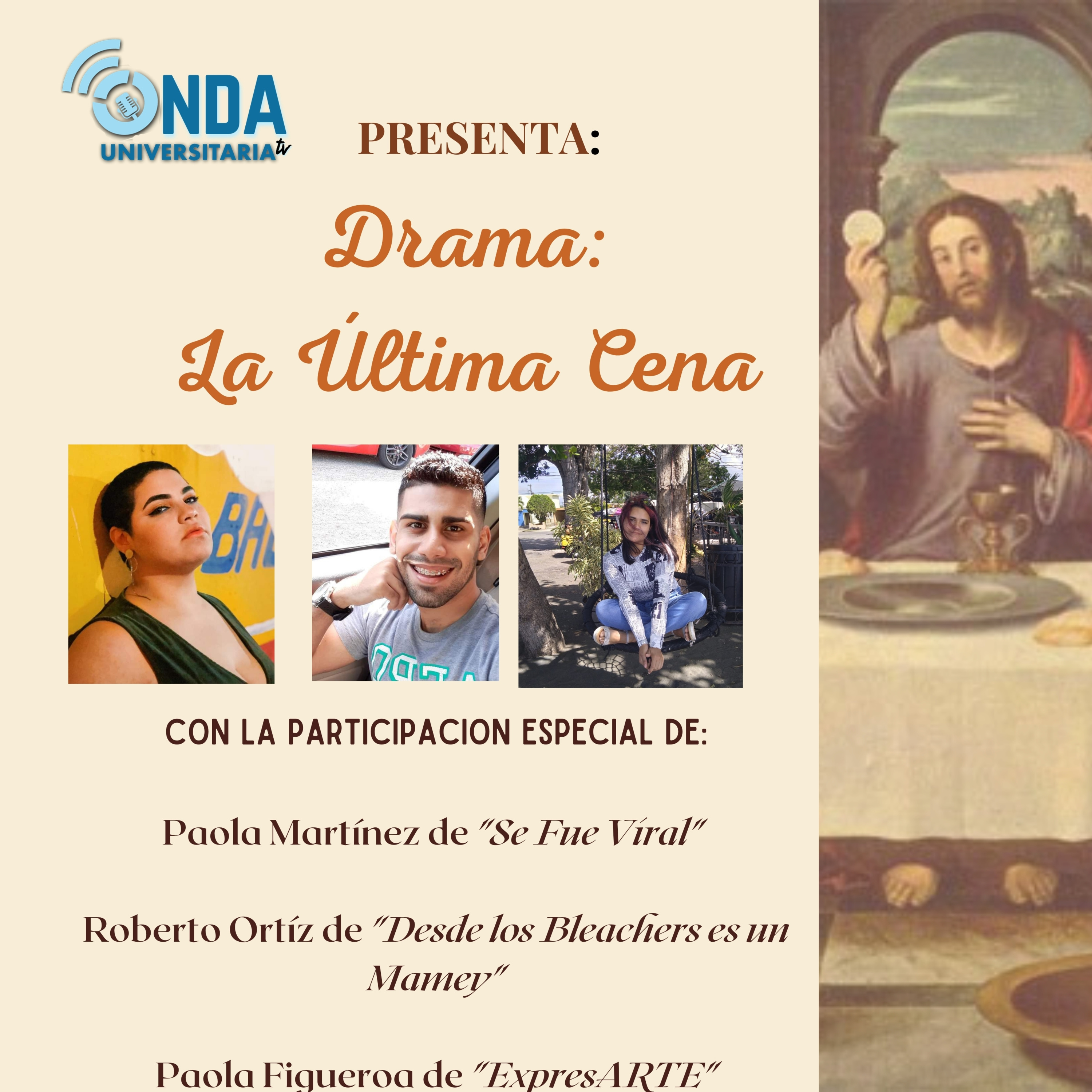 Hoy, Jueves Santo, “Se Fue Viral” “Desde los bleachers es un mamey” y “ExpresARTE” unen fuerzas para traer a la vida la estampa de “La Última Cena”. Paola Martínez, Roberto Ortiz y Paola Figueroa dialogan sobre lo que se conmemora en Jueves Santo y recrean lo ocurrido hace siglos atrás.