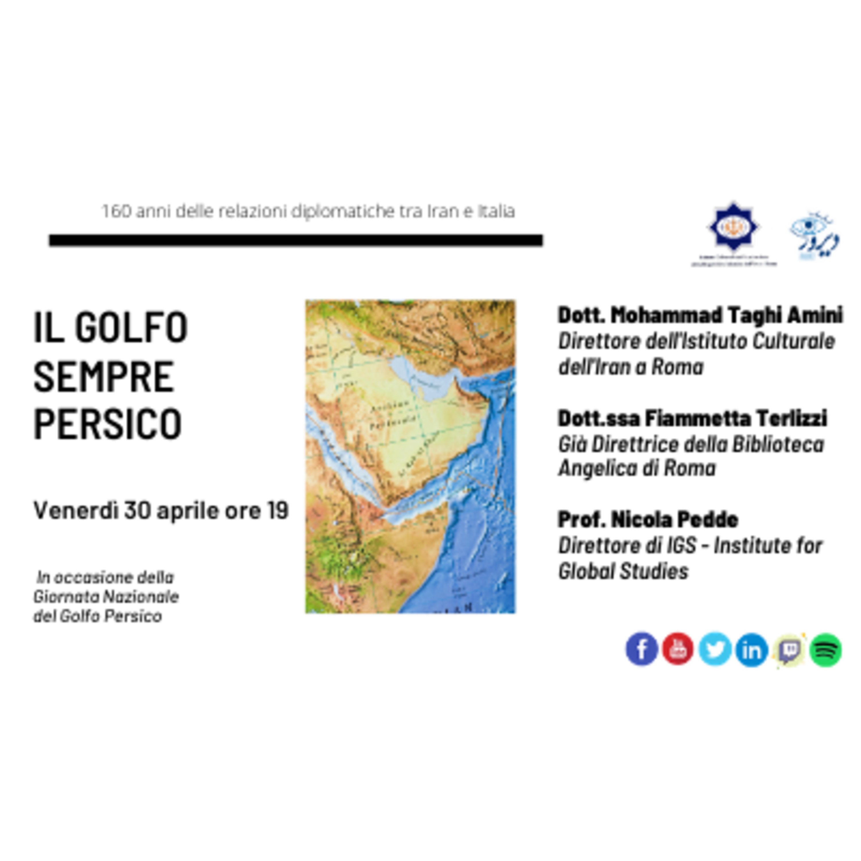 In occasione della Giornata Nazionale del Golfo Persico. Dott. Mohammad Taghi Amini – Direttore dell’Istituto Culturale dell’Iran a Roma; Dott.ssa Fiammetta Terlizzi – Già Direttrice della Biblioteca Angelica di Roma; Prof. Nicola Pedde, Direttore di IGS – Institute for Global Studies
