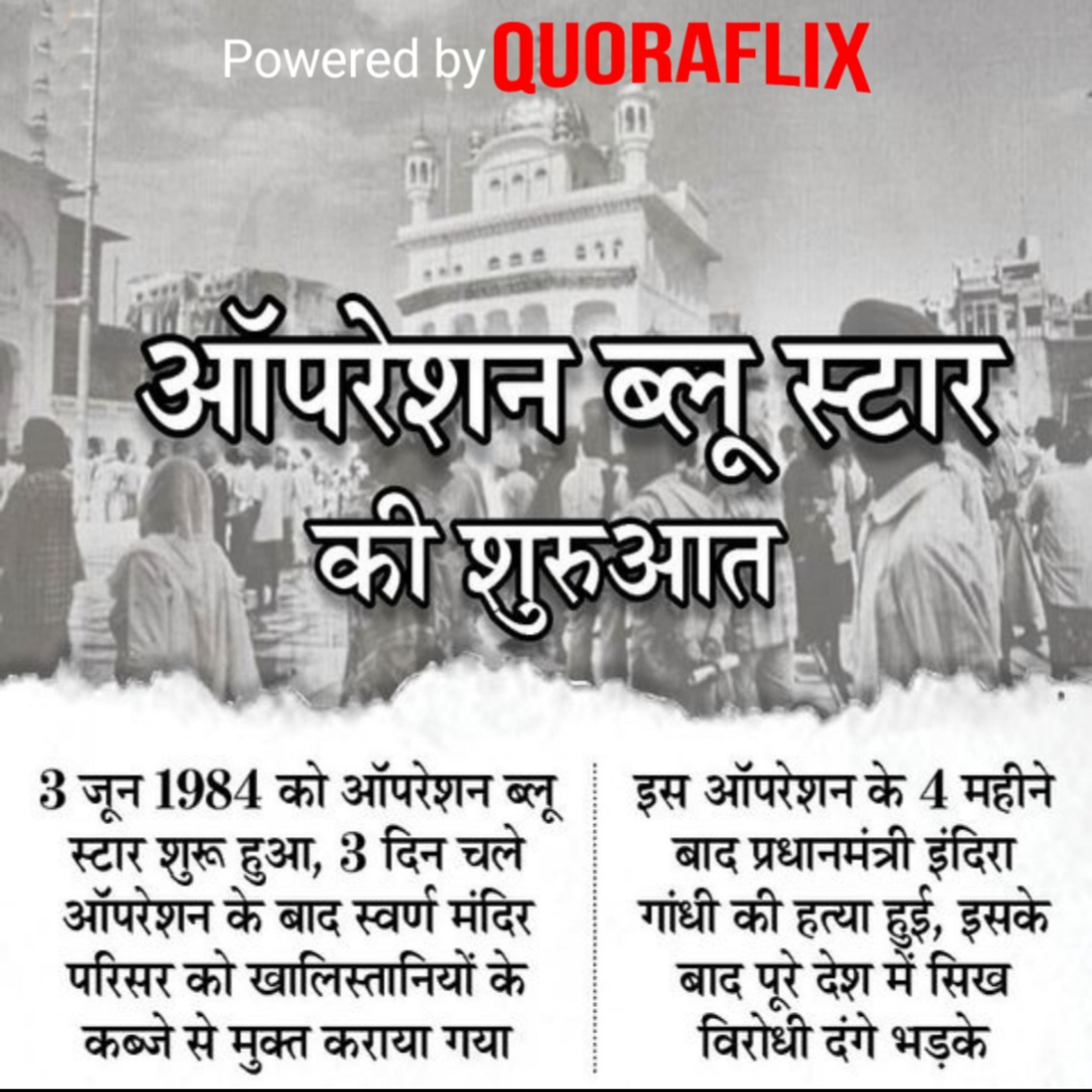 ऑपरेशन ब्लू स्टार की शुरुआत, जो इंदिरा गांधी की हत्या की वजह बना भारतीय सेना ने आज ही के दिन 1984 में ऑपरेशन ब्लू स्टार शुरू किया था। पंजाब के अमृतसर में स्थित हरिमंदिर साहिब यानी स्वर्ण मंदिर परिसर पर खालिस्तान समर्थक जरनैल सिंह भिंडरावाले और उनके समर्थकों ने कब्जा कर लिया था। स्वर्ण मंदिर को खालिस्तानियों के कब्जे से मुक्त कराने के लिए शुरू हुआ ये ऑपरेशन 3 दिनों तक चला। इसमें 500 से भी ज्यादा लोगों की मौत हुई। इनमें सेना के जवान और अधिकारी भी शामिल थे।