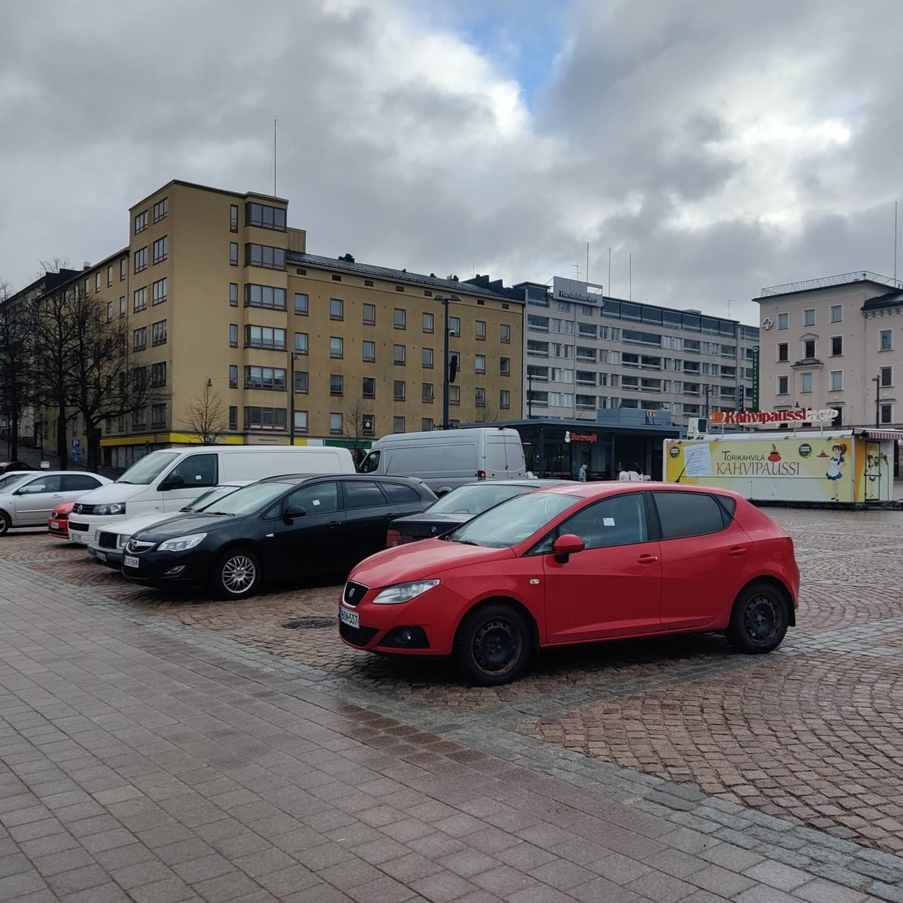 Kuvateksti: Lauantaina ennen kello 9:ää torille oli siirretty toistakymmentä autoa.