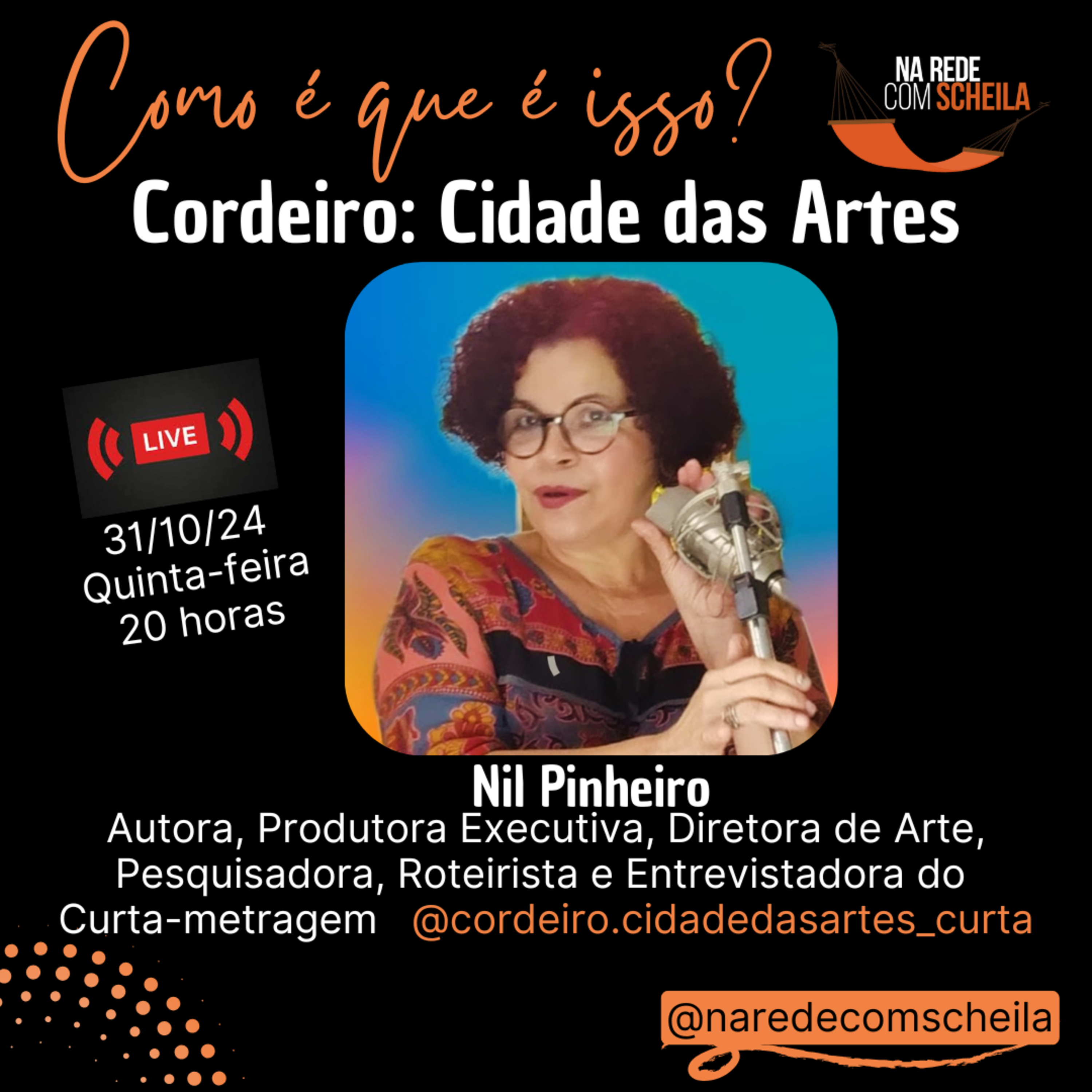 "Cordeiro: Cidade das Artes" é o tema da live "Como é que é isso?" Na Rede com Scheila, do dia 31 de outubro. A convidada é Nil Pinheiro, artista plástica, designer, profissional de marketing e comunicação, ilustradora, escritora e agora entra para o universo do cinema através do curta-metragem em formato de documentário "Cordeiro, Cidade das Artes", como autora, produtora executiva, diretora de arte, pesquisadora, roteirista, narradora, entrevistadora, e muito mais!