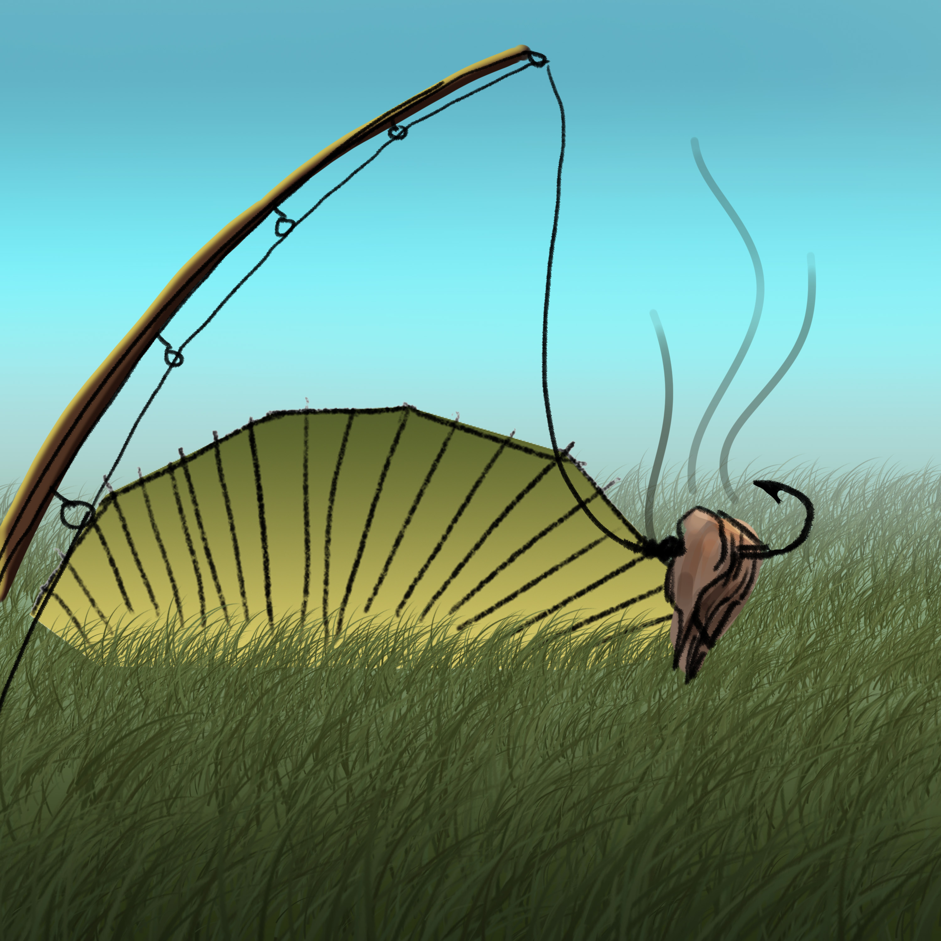 Some children hook some old meat on a hook and use their fishing pole to see what they can catch on the other side of that there bush. They might catch something unexpected.