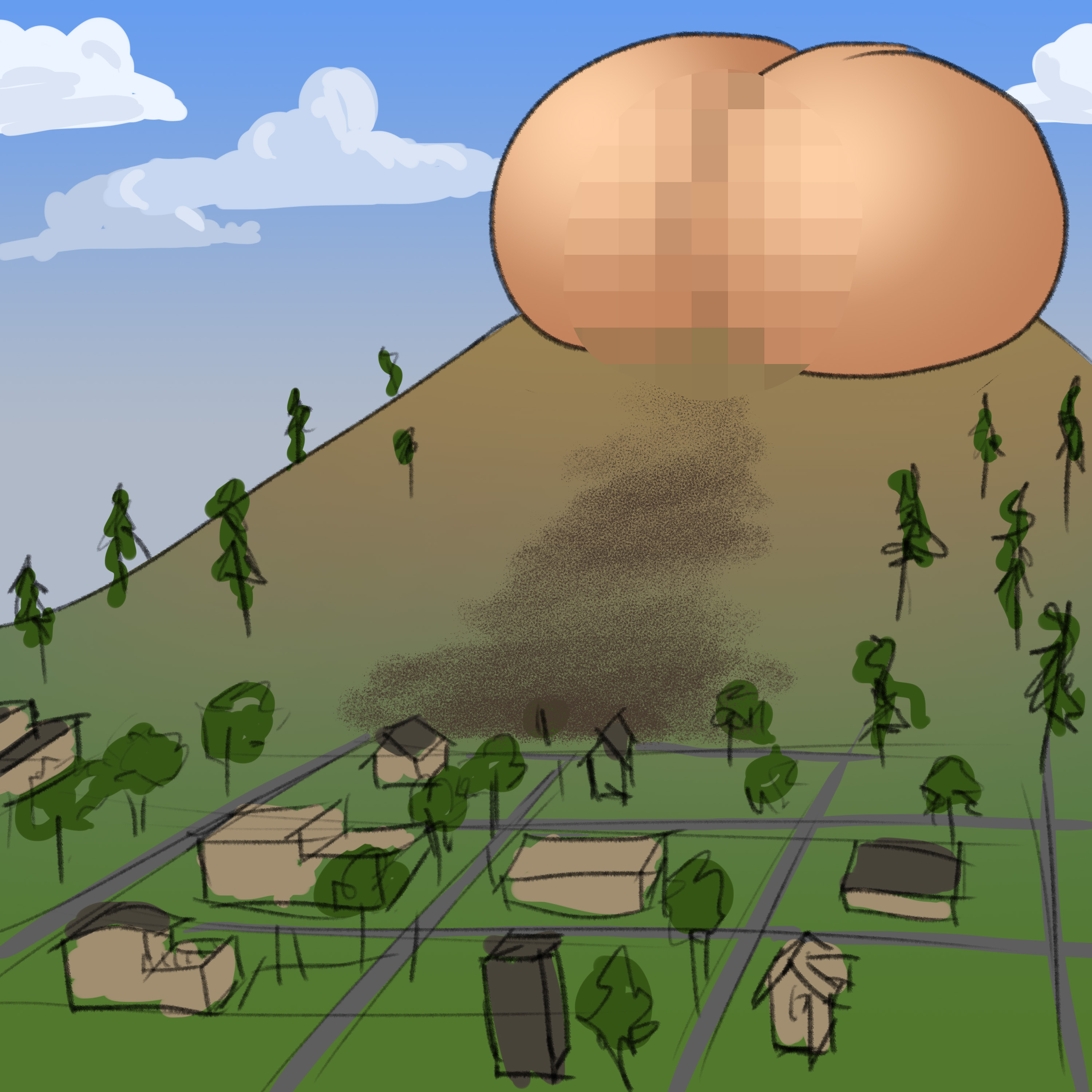 On a hill above a small town is a big butt that, with gruesome regularity, deposits an unwelcome present. The villagers try to get it to stop.