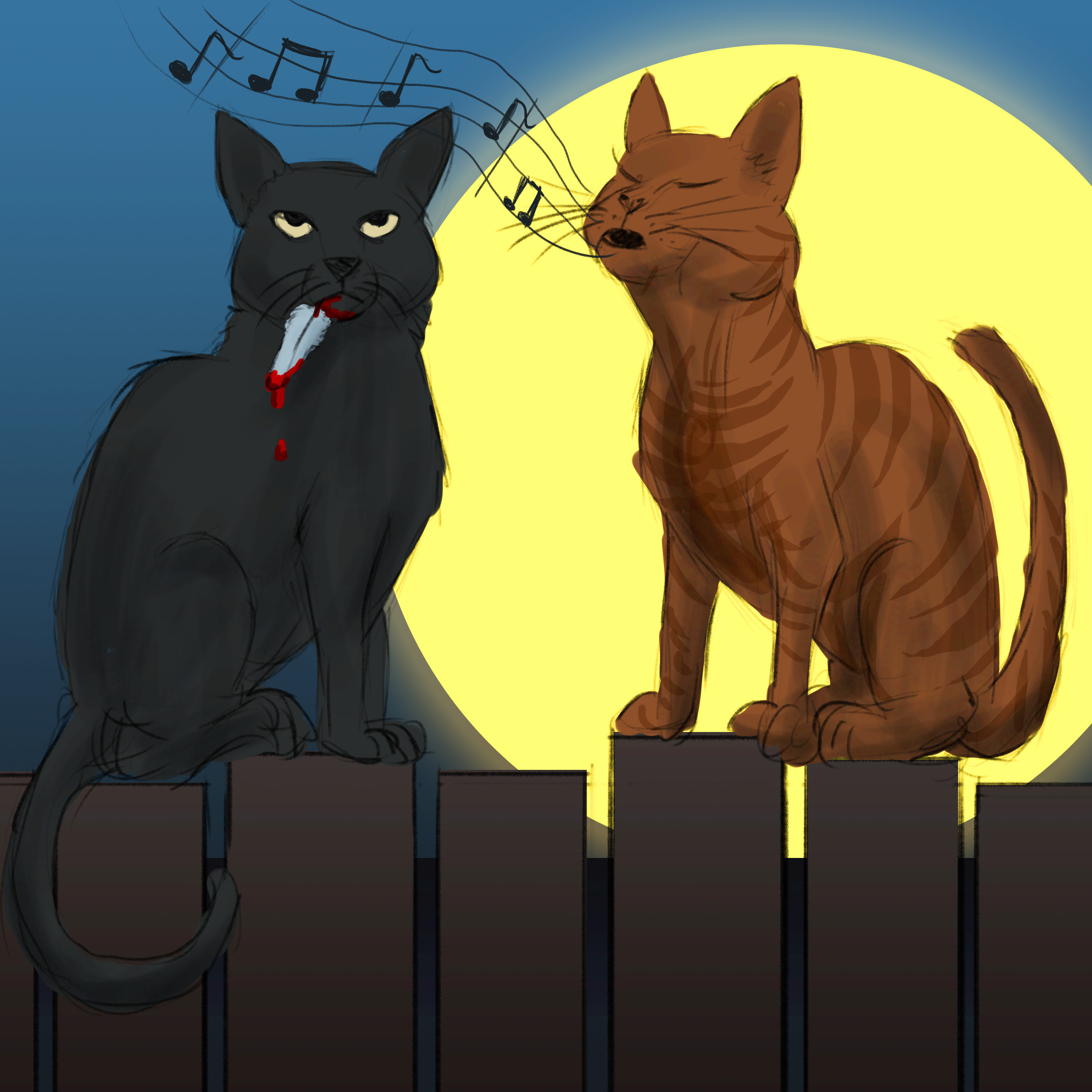 On a cold, moonlit night, two cats are on the hunt. After they have success, they take a break for some caterwauling, which aggravates old man Nolan so much that he throws stuff at them.
