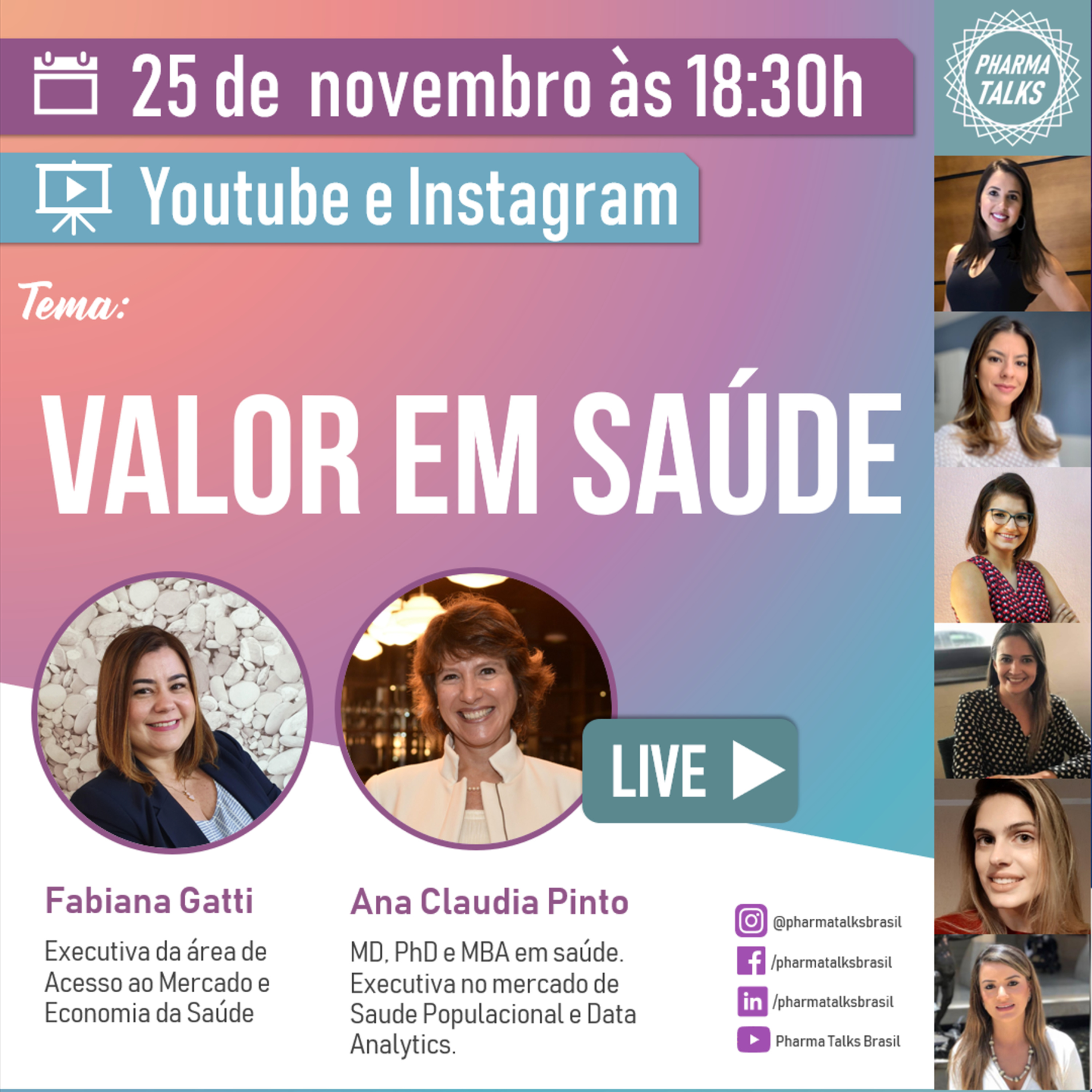 “Valor em Saúde”, um bate papo sobre o tema com a participação de duas convidadas especiais experts no assunto: - FABIANA GATTI, Executiva da área de Acesso ao Mercado e Economia da Saúde - Ana Claudia Pinto, MD, PhD, MBA em saúde, executiva no mercado de Saúde Populacional e Data Analytics.