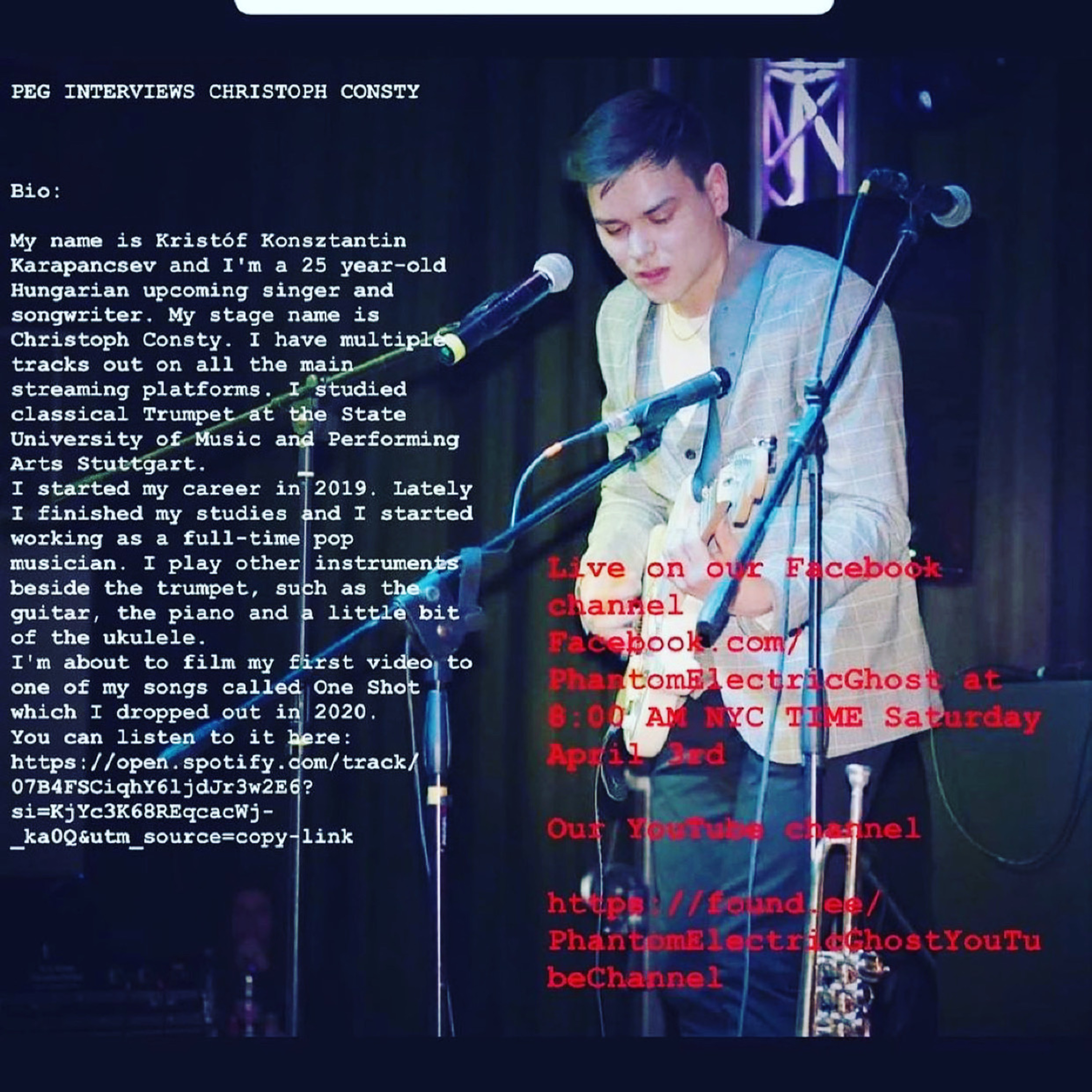 My name is Kristóf Konsztantin Karapancsev and I'm a 25 year-old Hungarian upcoming singer and songwriter. My stage name is Christoph Consty. I have multiple tracks out on all the main streaming platforms. I studied classical Trumpet at the State University of Music and Performing Arts Stuttgart.