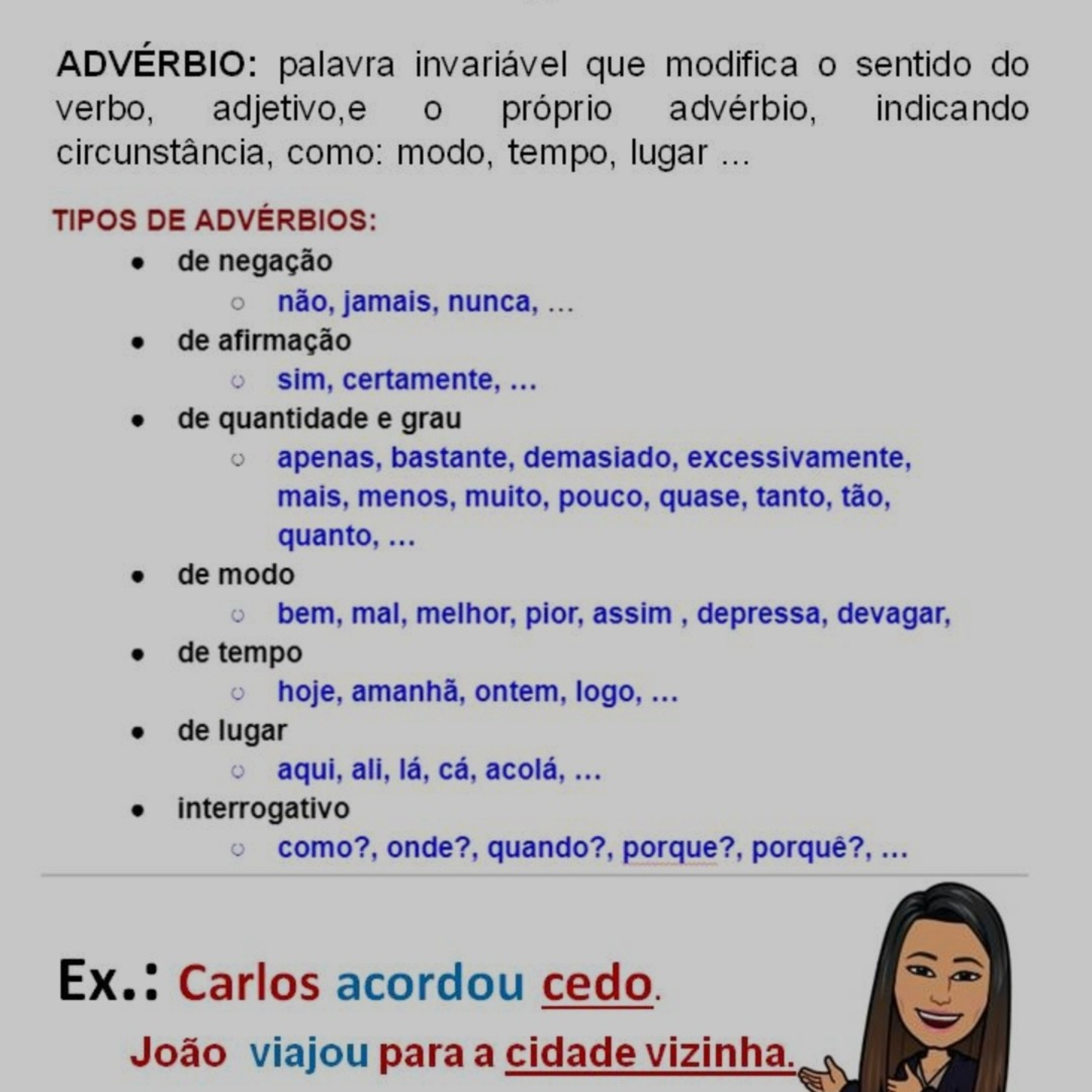 Palavra invariável que modifica o verbo, adjetivo e o próprio advérbio indicando um sentindo circunstancial de modo, tempo, lugar, negação...