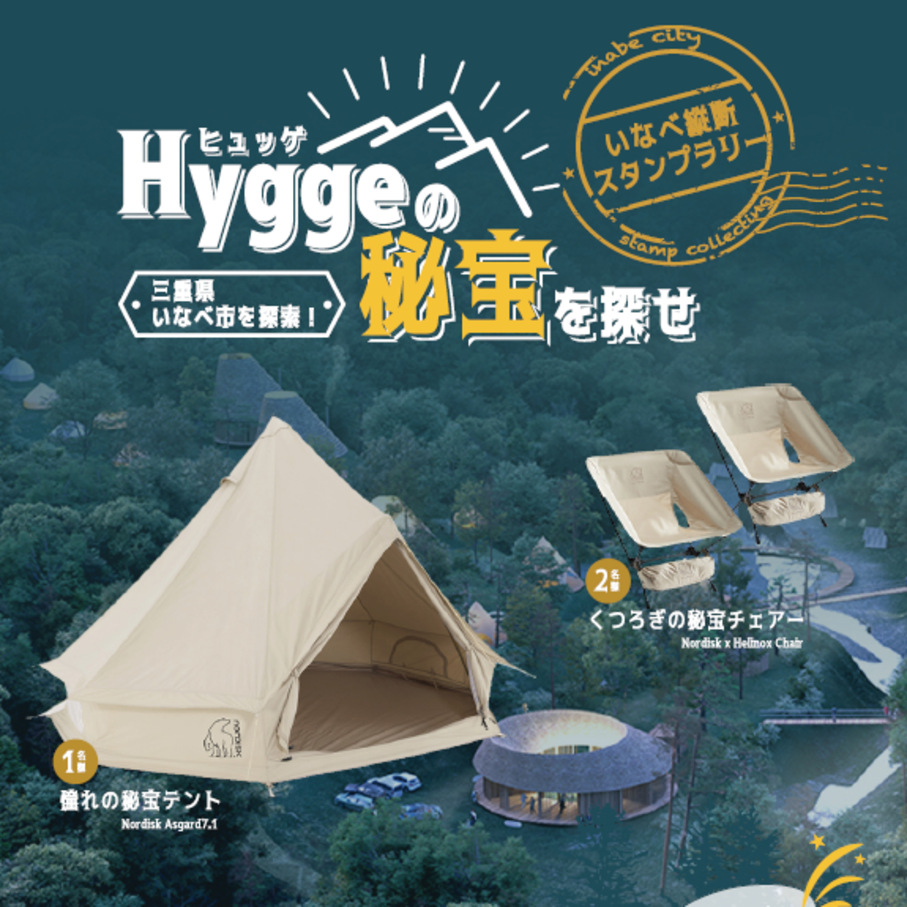 LINEを活用したアウトドアシティいなべを巡るスタンプラリー。宇賀渓キャンプ場再開発で連携するノルディスクのテント、市内アーティストの草木染めの手ぬぐいなど、いなべならではの素敵なプレゼントが当たります。ぜひお誘いあわせの上、ご参加ください