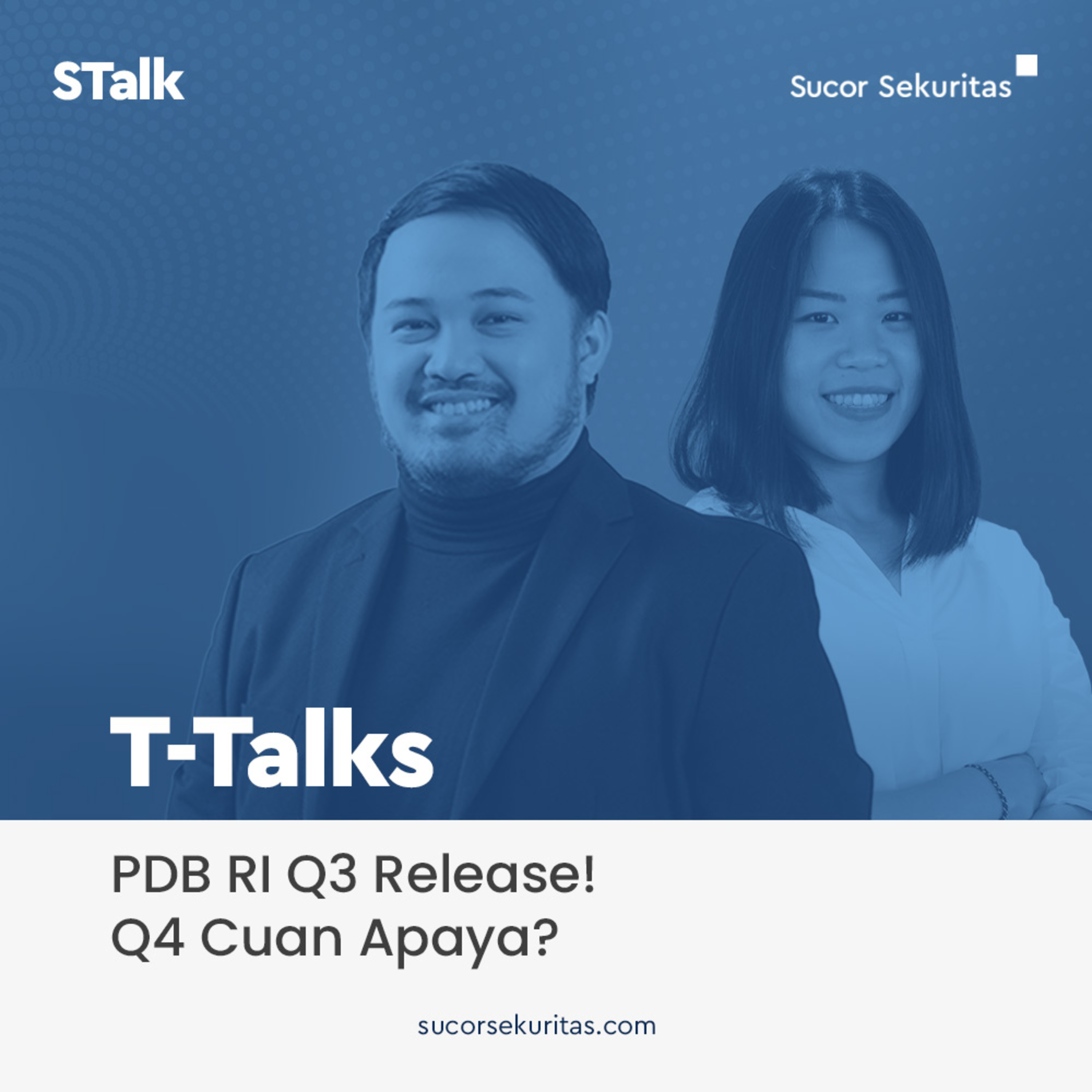 Hasil PDB RI Q3 sudah rilis! Gimana ya strategi agar cuan di kuartal 4? Yuk diskusi bareng Ivy Tjahjadi dalam Podcast T-Talks Selasa, 7 November 2023, yang dipandu oleh host kesayangan Cumin Zedekiah Joa, Strategic Partnership Sucor Sekuritas.