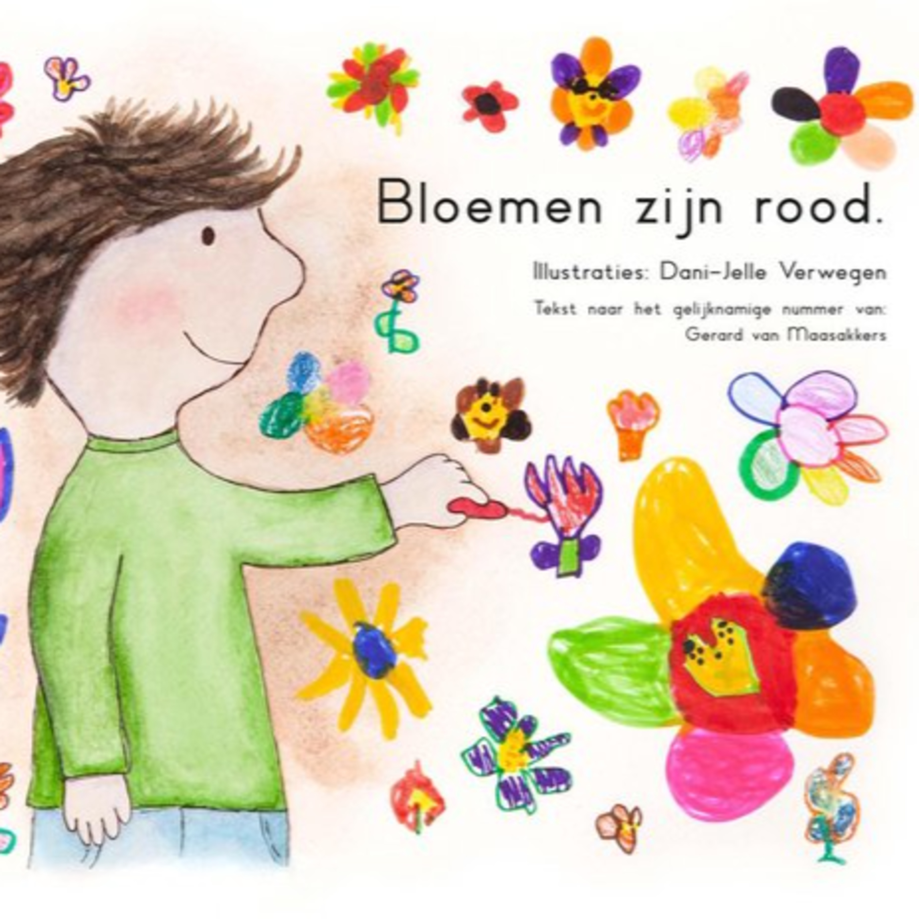 Het verhaal gaat over een jongen die voor het eerst naar school gaat en van de juffrouw alleen rode bloemen met groene blaadjes mag tekenen, terwijl het jongetje allemaal mooie kleuren overal ziet. Na een tijdje tekent hij dan ook alleen nog maar rode bloemen met groene blaadjes, netjes in de rij… Gelukkig eindigt het verhaal wel goed, met een hele kleurrijke pagina. Toen de kleuters uit de klas van juffrouw Dani-Jelle thuis moesten blijven tijdens de lockdown, heeft Dani-Jelle ze betrokken bij haar tekenproces met een filmpje. Als snel gleden er envelopjes met prachtige bloemen in de brievenbus van school. Deze tekeningen zijn ook verwerkt in het boek. Eén leerling had extra buiten de lijntjes gedacht, wat voor een leuke verrassing op de laatste pagina zorgt!