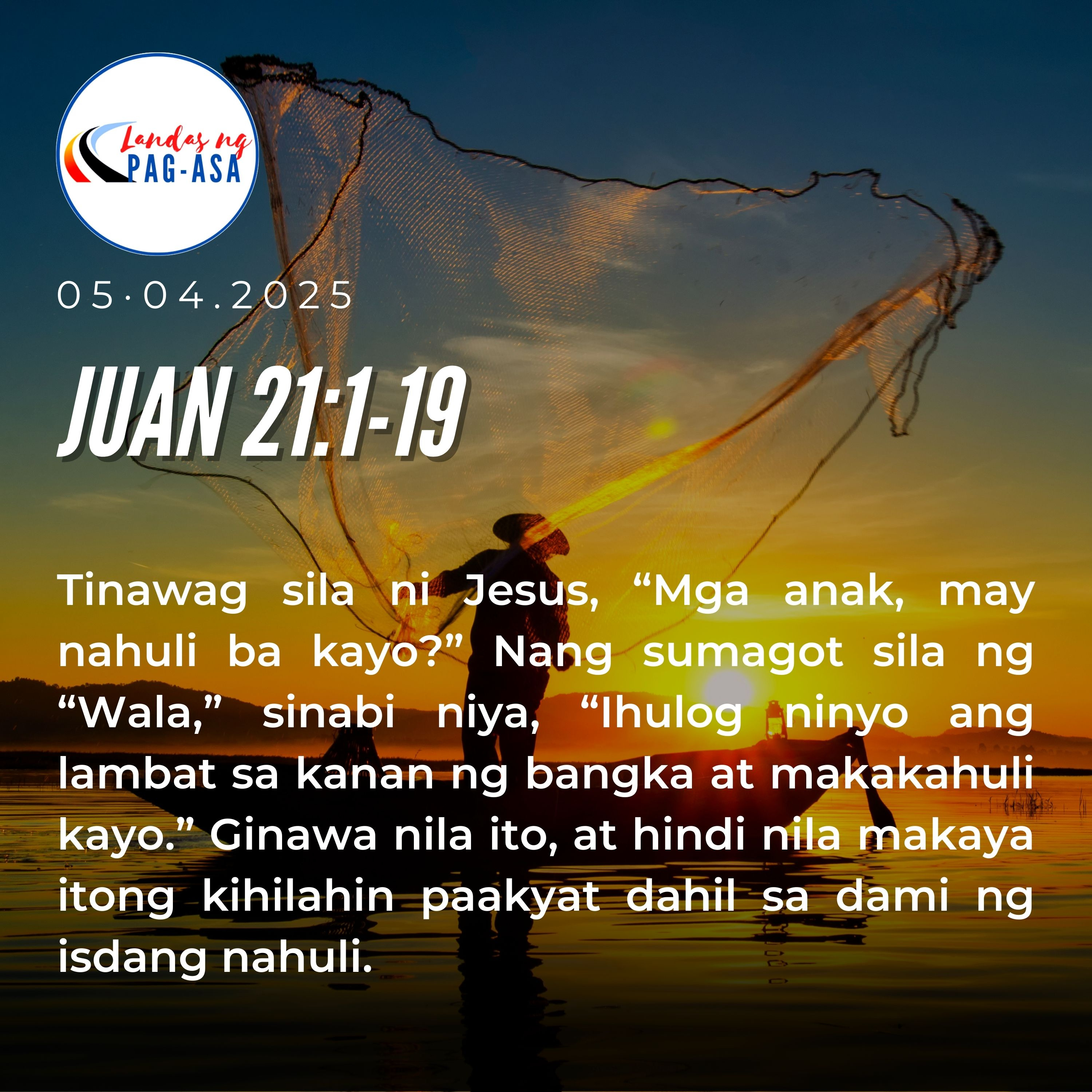 Noong panahong iyon, muling napakita si Hesus sa mga alagad sa tabi ng Lawa ng Tiberias. Ganito ang pangyayari. Magkakasama sina Simon Pedro, Tomas na tinaguriang Kambal, Natanael na taga-Cana, Galilea, ang mga anak ni Zebedeo, at dalawang pang alagad. Sinabi sa kanila ni Simon Pedro, “Mangingisda ako.” “Sasama kami,” wika nila. Umalis sila at lumulan sa bangka, subalit walang nahuli nang gabing iyon. Nang magbubukang-liwayway na, tumayo si Hesus sa pampang, subalit hindi siya nakilala ng mga alagad. Sinabi niya, “Mga anak, mayroon ba kayong huli?” “Wala po,” tugon nila. “Ihulog ninyo ang lambat sa gawing kanan ng bangka at makahuhuli kayo,” sabi ni Hesus. Inihulog nga nila ang lambat at hindi nila ito mahila sa dami ng huli. Sinabi kay Pedo ng alagad na minamahal ni Hesus, “Ang Panginoon iyon!” Nang marinig ito ni Simon Pedro, siya’y nagsuot ng damit sapagkat hubad siya at tumalon sa tubig. Ang kasama niyang mga alagad ay sumapit sa pampang, sakay ng munting bangka, hila-hila ang lambat na puno ng isda. Hindi sila gaanong kalayuan sa pampang – mga siyamnapung metro lamang. Pag-ahon nila sa pampang ay nakakita sila roon ng mga baga na may isdang nakaihaw, at ilang tinapay. “Magdala kayo rito ng ilang isdang nahuli ninyo,” sabi ni Hesus. Kaya’t sumampa sa bangka si Simon Pedro at hinila sa pampang ang lambat na puno ng malalaking isda – sandaan at limampu’t tatlong lahat. Hindi napunit ang lambat, kahit gaano karami ang isda. “Halikayo at mag-almusal tayo,” sabi ni Hesus. Isa man sa mga alagad ay walang nangahas magtanong sa kanya kung sino siya, sapagkat alam nila na siya ang Panginoon. Lumapit si Hesus, kinuha ang tinapay at ibinigay sa kanila, gayon din ang isda.