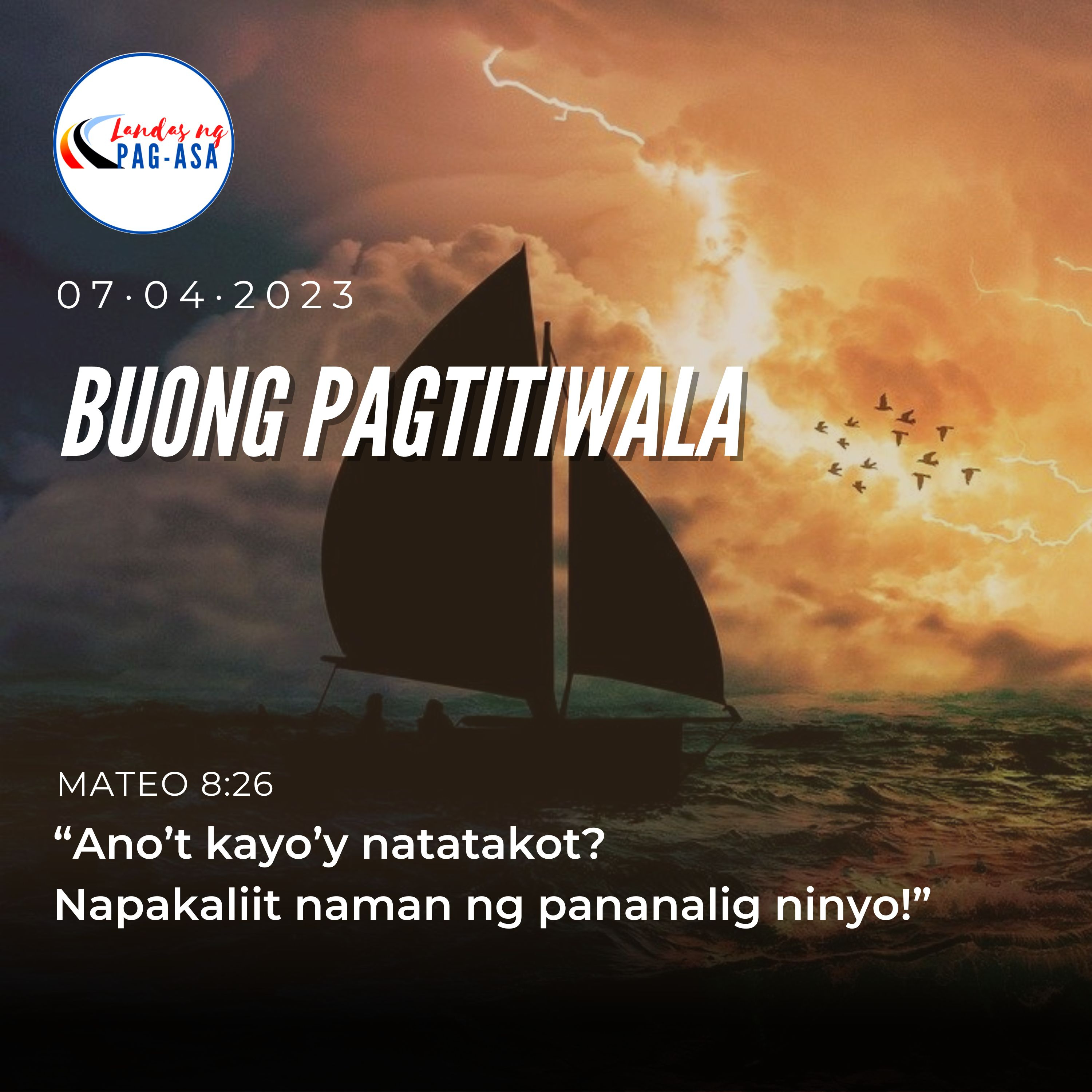 Noong panahong iyon, sumakay si Hesus sa bangka, kasama ang kanyang mga alagad. Bumugso sa lawa ang isang malakas na unos at halos matabunan ng mga alon ang bangka. Ngunit natutulog noon si Hesus. Kaya’t nilapitan siya ng mga alagad at ginising. “Panginoon, tulungan ninyo kami!” sabi nila. “Lulubog tayo!” At sinabi niya sa kanila, “Ano’t kayo’y natatakot? Napakaliit naman ng pananalig ninyo!” Bumangon siya, sinaway ang hangin at ang dagat, at tumahimik ang mga ito. Namangha silang lahat at ang sabi, “Anong tao ito? Kahit ang hangin at ang dagat ay tumatalima sa kanya!”