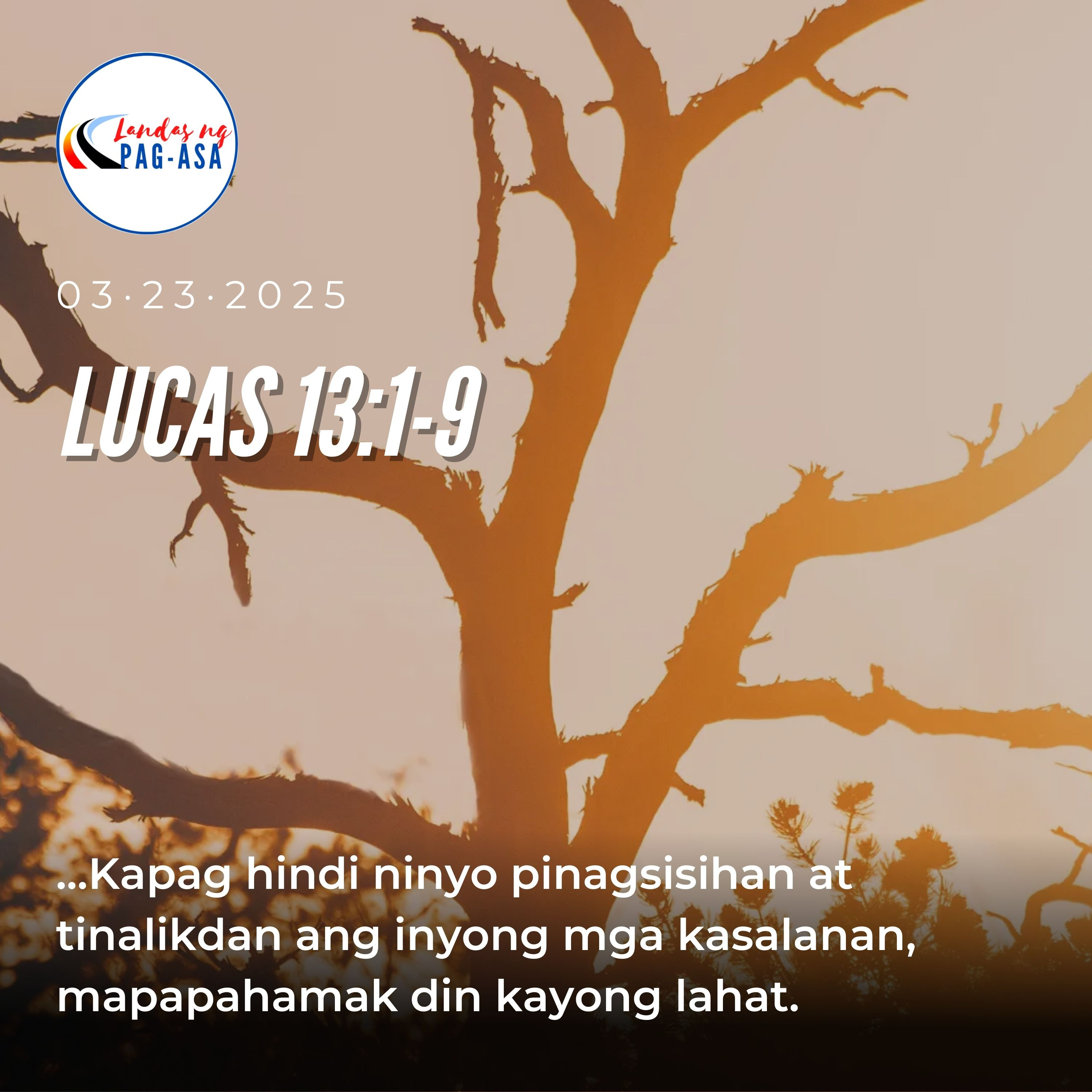 LINGGO, MARSO 23, 2025 Ikatlong Linggo ng Apatnapung Araw na Paghahanda para sa Pasko ng Pagkabuhay Paggunita kay San Domitius at mga kasama, Mga Martir MABUTING BALITA: LUCAS 13: 1- 9 Dumating noon ang ilang tao at ibinalita kay Hesus na ipinapatay ni Pilato ang ilang Galileo samantalang ang mga ito’y naghahandog sa Diyos. Sinabi niya sa kanila, “Akala ba ninyo, higit na makasalanan ang mga Galileong ito kaysa ibang mga taga-Galilea dahil sa gayun ang sinapit nila? Hindi! Ngunit sinasabi ko sa inyo: kapag hindi ninyo pinagsisihan at tinalikdan ang inyong mga kasalanan, mapapahamak din kayong lahat. At ang labingwalong namatay nang mabagsakan ng tore sa Siloe – sa akala ba ninyo’y higit silang makasalanan kaysa ibang naninirahan sa Jerusalem? Hindi! Ngunit sinasabi ko sa inyo: kapag hindi ninyo pinagsisihan at tinalikdan ang inyong mga kasalanan, mapapahamak din kayong lahat.”Sinabi sa kanila ni Hesus ang talinghagang ito: “May isang tao na may puno ng igos sa kanyang ubasan. Minsan, tiningnan niya kung may bunga ito, ngunit wala siyang nakita. Kaya’t sinabi niya sa tagapag-alaga ng ubasan, ‘Tatlong taon na akong pumaparito at naghahanap ng bunga sa punong ito, ngunit wala akong makita. Putulin mo na! Nakasisikip lang iyan!’ Ngunit sumagot ang tagapag-alaga, ‘Huwag po muna nating putulin sa taong ito. Huhukayan ko ang palibot at lalagyan ng pataba. Kung mamunga po ito sa darating na taon, mabuti; ngunit kung hindi, putulin na natin!’”Reflection by Edwin Cano: Principal Consultant (Electric Power System Planning and Operations); Servant Worker for Brotherhood of the King, Communion Prayer Group and The Heart of Mary prayer group.#POHopegiver #LandasngPagasa #catholic #scriptures #bibleeadings #Jesus #CatholicChurch #christian #church #faith #god #jesuschrist #love #pray #bible #christianity #prayer #hope #gospel