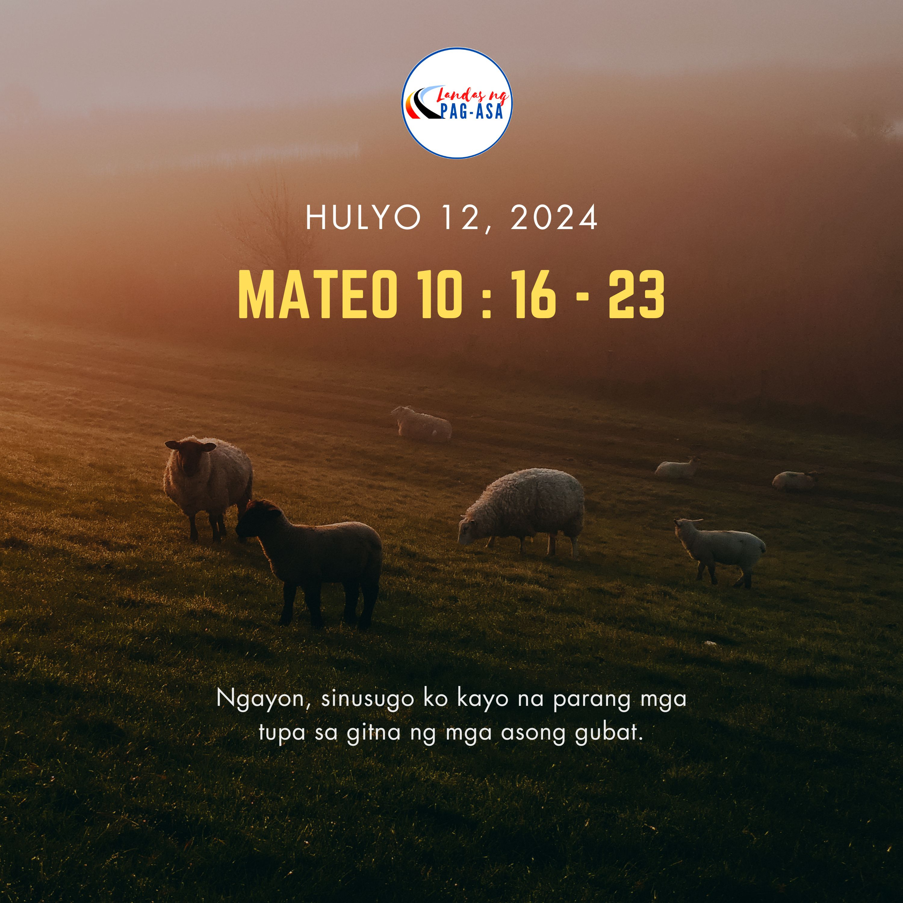 Noong panahong iyon, sinabi ni Hesus sa kanyang mga apostol, “Ngayon, sinusugo ko kayo na parang mga tupa sa gitna ng mga asong gubat. Maging matalino kayo, gaya ng mga ahas, at matapat, gaya ng mga kalapati. Mag-ingat kayo, sapagkat may mga taong magkakanulo sa inyo sa mga hukuman; at hahagupitin nila kayo sa mga sinagoga. Dahil sa akin, ihaharap kayo sa mga gobernador at mga hari, at magpapatotoo kayo sa harapan nila at ng mga Hentil. Kapag nililitis na kayo, huwag kayong mabalisa tungkol sa sasabihin ninyo o kung paano ninyo sasabihin. Pagdating ng oras, ito’y ipagkakaloob sa inyo. Sapagkat hindi kayo ang magsasalita kundi ang Espiritu ng inyong Ama ang magsasalita sa pamamagitan ninyo.