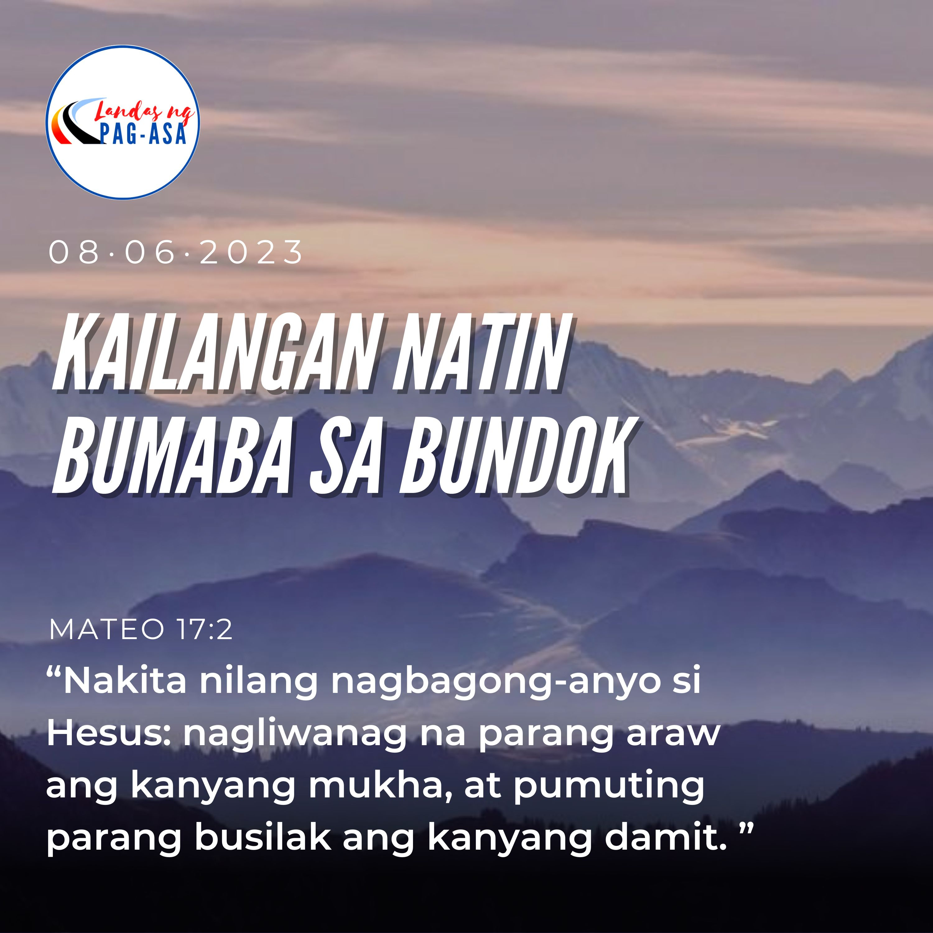Noong panahong iyon, isinama ni Hesus si Pedro, at ang magkapatid na Santiago at Juan, at sila’y umakyat sa isang mataas na bundok. Samantalang sila’y naroon, nakita nilang nagbagong-anyo si Hesus: nagliwanag na parang araw ang kanyang mukha, at pumuting parang busilak ang kanyang damit. Nakita na lamang at sukat ng tatlong alagad sina Moises at Elias na nakikipag-usap kay Hesus. Kaya’t sinabi ni Pedro kay Hesus, “Panginoon, mabuti pa’y dumito na tayo. Kung ibig ninyo, gagawa ako ng tatlong kubol: isa sa inyo, isa kay Moises at isa kay Elias.” Nagsasalita pa siya nang liliman sila ng isang maningning na ulap. At mula rito’y may tinig na nagsabi, “Ito ang minamahal kong Anak na lubos kong kinalulugdan. Pakinggan ninyo siya!” Ang mga alagad ay natakot nang gayun na lamang nang marinig nila ang tinig, at sila’y napasubasob. Ngunit nilapitan sila ni Hesus at hinipo. “Tumindig kayo,” sabi niya, “huwag kayong matakot.” At nang tumingin sila ay wala silang nakita kundi si Hesus.