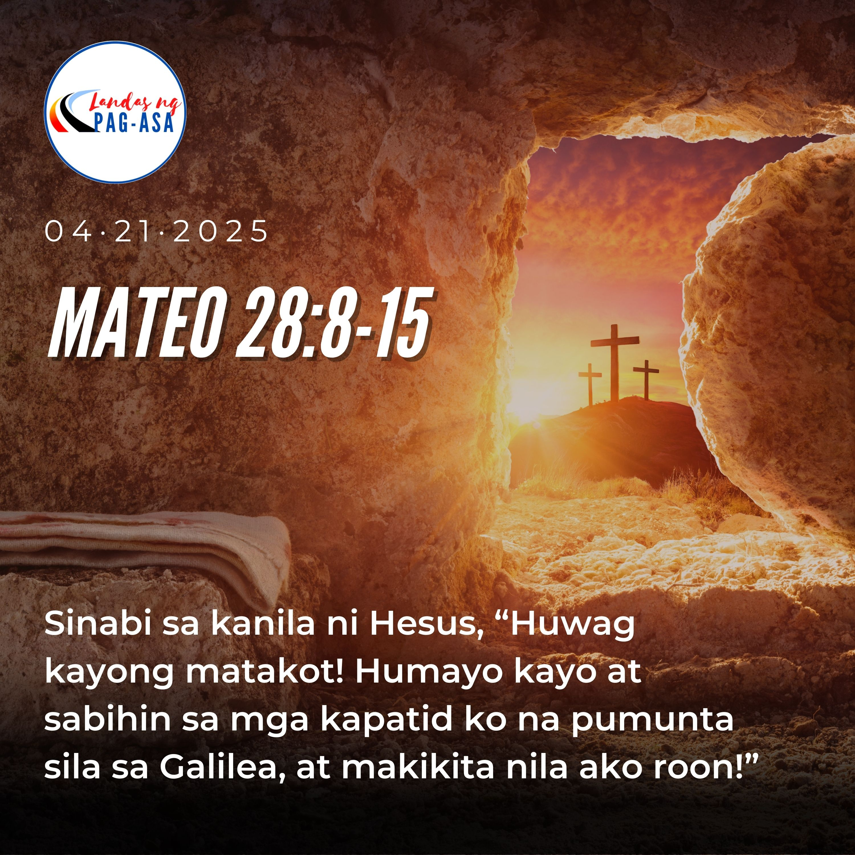 LUNES, ABRIL 21, 2025 Lunes sa Walong Araw na Pagdiriwang ng Pasko ng Muling PagkabuhayPaggunita kay San Anselmo, ArsobispoMABUTING BALITA: MATEO 28 : 8 - 15Noong panahong iyon, dali-daling umalis ang mga babae ng libingan. Pinagharian sila ng magkahalong takot at galak. At patakbong nagpunta sa mga alagad upang ibalita ang nangyari.Ngunit sinalubong sila ni Hesus at binati. At lumapit sila, niyakap ang kanyang paa at sinamba siya. Sinabi sa kanila ni Hesus, “Huwag kayong matakot! Humayo kayo at sabihin sa mga kapatid ko na pumunta sila sa Galilea, at makikita nila ako roon!”Pagkaalis ng mga babae, pumunta naman sa lungsod ang ilan sa mga kawal na nagbabantay sa libingan at ibinalita sa mga punong saserdote ang lahat ng nangyari. Nagtipun-tipon ang mga ito at matapos makipagpulong sa matatanda ng bayan, sinuhulan nang malaki ang mga kawal. At inutusan sila na ganito ang ipinamalita, “Samantalang natutulog kami kagabi, naparito ang kanyang mga alagad at ninakaw ang kanyang bangkay.” Sinabi pa nila, “Huwag kayong mag-alaala, makarating man ito sa gobernador. Kami ang bahala!” Tinanggap ng mga bantay ang salapi at ginawa ang bilin sa kanila. Hanggang ngayon, ito pa rin ang sabi-sabi ng mga Judio.Reflection by Eric Rivas : Director of Services for a multinational company. Pastoral Leader and District Coordinator - Ang Ligaya ng Panginoon. #LandasngPagasa #catholic #scriptures #bibleeadings #Jesus #CatholicChurch #christian #church #faith #god #jesuschrist #love #pray #bible #christianity #prayer #hope #gospel