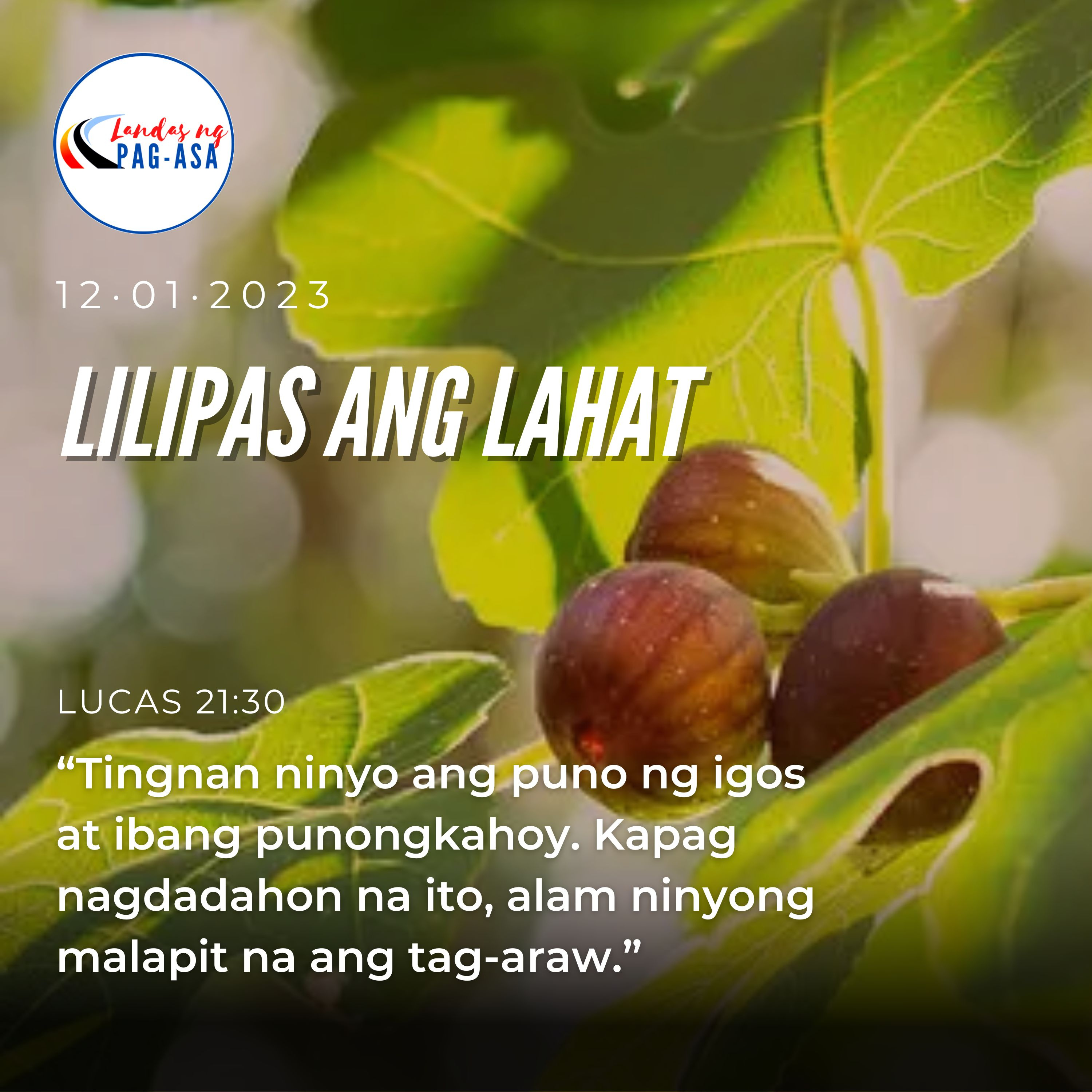 Noong panahong iyon, sinabi ni Hesus sa kanyang mga alagad ang isang talinghaga: “Tingnan ninyo ang puno ng igos at ibang punongkahoy. Kapag nagdadahon na ito, alam ninyong malapit na ang tag-araw. Gayun din naman, kapag nakita ninyong nangyayari na ang mga ito, malalaman ninyong malapit nang maghari ang Diyos. Tandaan ninyo: magaganap ang lahat ng ito bago mamatay ang lahat ng taong nabubuhay sa ngayon. Mawawala ang langit at ang lupa, ngunit ang salita ko’y hindi magkakabula.”