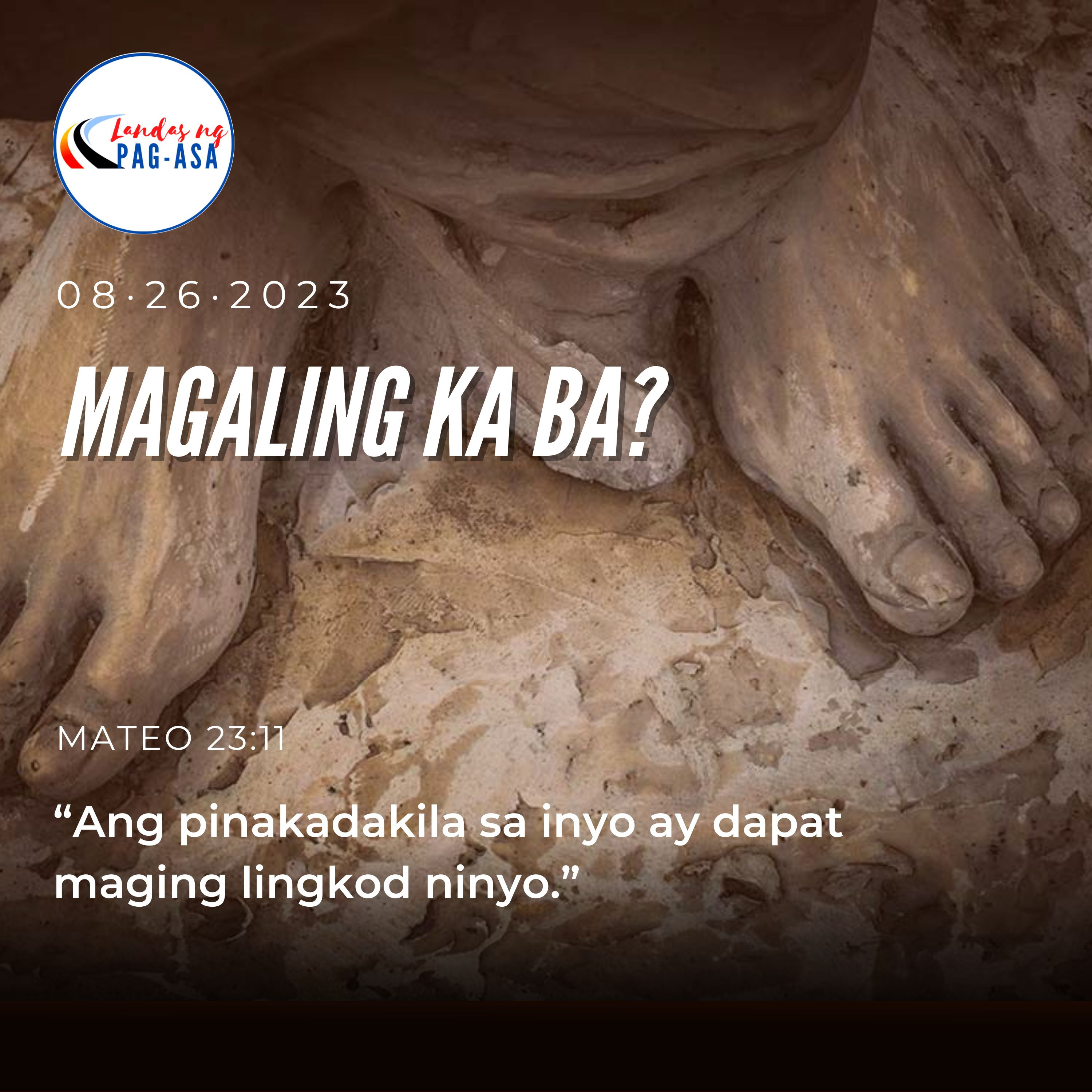Noong panahong iyon, sinabi ni Hesus sa mga tao at sa kanyang mga alagad, “Ang mga eskriba at ang mga Pariseo ang kinikilalang tagapagpaliwanag ng Kautusan ni Moises. Kaya’t gawin ninyo ang itinuturo nila at sundin ang kanilang iniuutos. Ngunit huwag ninyong tularan ang kanilang gawa, sapagkat hindi nila isinasagawa ang kanilang ipinangangaral. Nagbibigkis sila ng mabibigat na dalahin at ipinapasan sa mga tao; ngunit ni daliri ay ayaw nilang igalaw upang tumulong sa pagdadala ng mga iyon. Pawang pakitang-tao ang kanilang mga gawa. Nilalaparan nila ang kanilang mga pilakterya at hinahabaan ang palawit sa laylayan ng kanilang mga damit. Ang ibig nila’y ang mga upuang pandangal sa mga piging at ang mga tanging luklukan sa mga sinagoga. Ang ibig nila’y pagpugayan sila sa mga liwasang-bayan, at tawaging guro. Ngunit kayo — huwag kayong patawag na guro, sapagkat iisa ang inyong Guro, at kayong lahat ay magkakapatid. At huwag ninyo tawaging ama ang sinumang tao sa lupa, sapagkat iisa ang inyong Ama, ang Amang nasa langit. Huwag kayong patawag na tagapagturo, sapagkat iisa ang inyong Tagapagturo, ang Mesias. Ang pinakadakila sa inyo ay dapat maging lingkod ninyo. Ang nagpakakataas ay ibababa, at ang nagpapakababa ay itataas.”