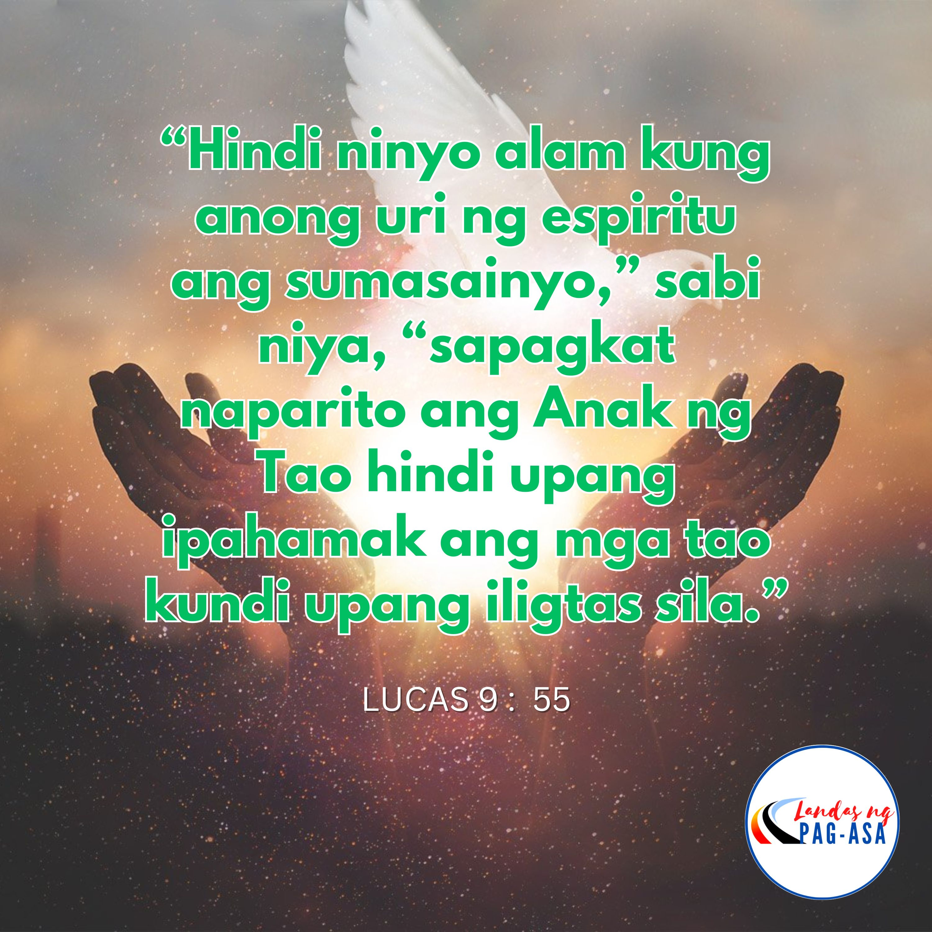 Nang nalalapit na ang panahong iaakyat si Hesus sa langit, ipinasiya niyang pumunta sa Jerusalem. Sinugo niya ang ilan upang mauna sa kanya. Humayo sila at pumasok sa isang nayon sa Samaria upang ipaghanda siya ng matutuluyan. Ngunit ayaw siyang tanggapin ng mga Samaritano sapagkat siya’y patungo sa Jerusalem. Nang makita ito nina Santiago at Juan ay kanilang sinabi, “Panginoon, payag ba kayong magpababa kami ng apoy mula sa langit upang pugnawin sila?” Ngunit bumaling siya at pinagsabihan sila. “Hindi ninyo alam kung anong uri ng espiritu ang sumasainyo,” sabi niya, “sapagkat naparito ang Anak ng Tao hindi upang ipahamak ang mga tao kundi upang iligtas sila.” At nagtungo sila sa ibang nayon.