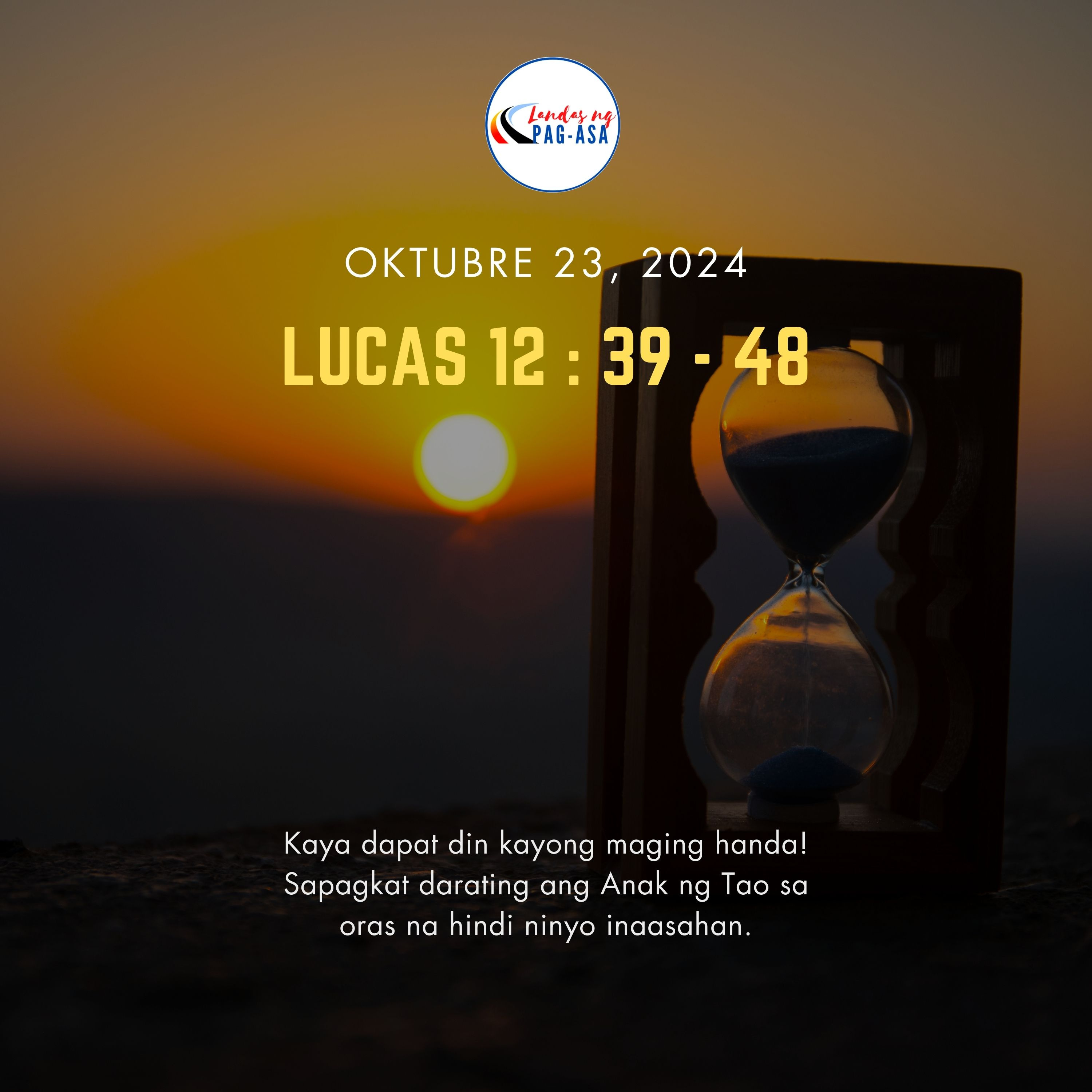 Unawain ninyo ito: kung alam ng panginoon ng bahay kung anong oras darating ang magnanakaw, hindi niya hahayaang pasukin ang kanyang bahay. Kaya dapat din kayong maging handa! Sapagkat darating ang Anak ng Tao sa oras na hindi ninyo inaasahan.”