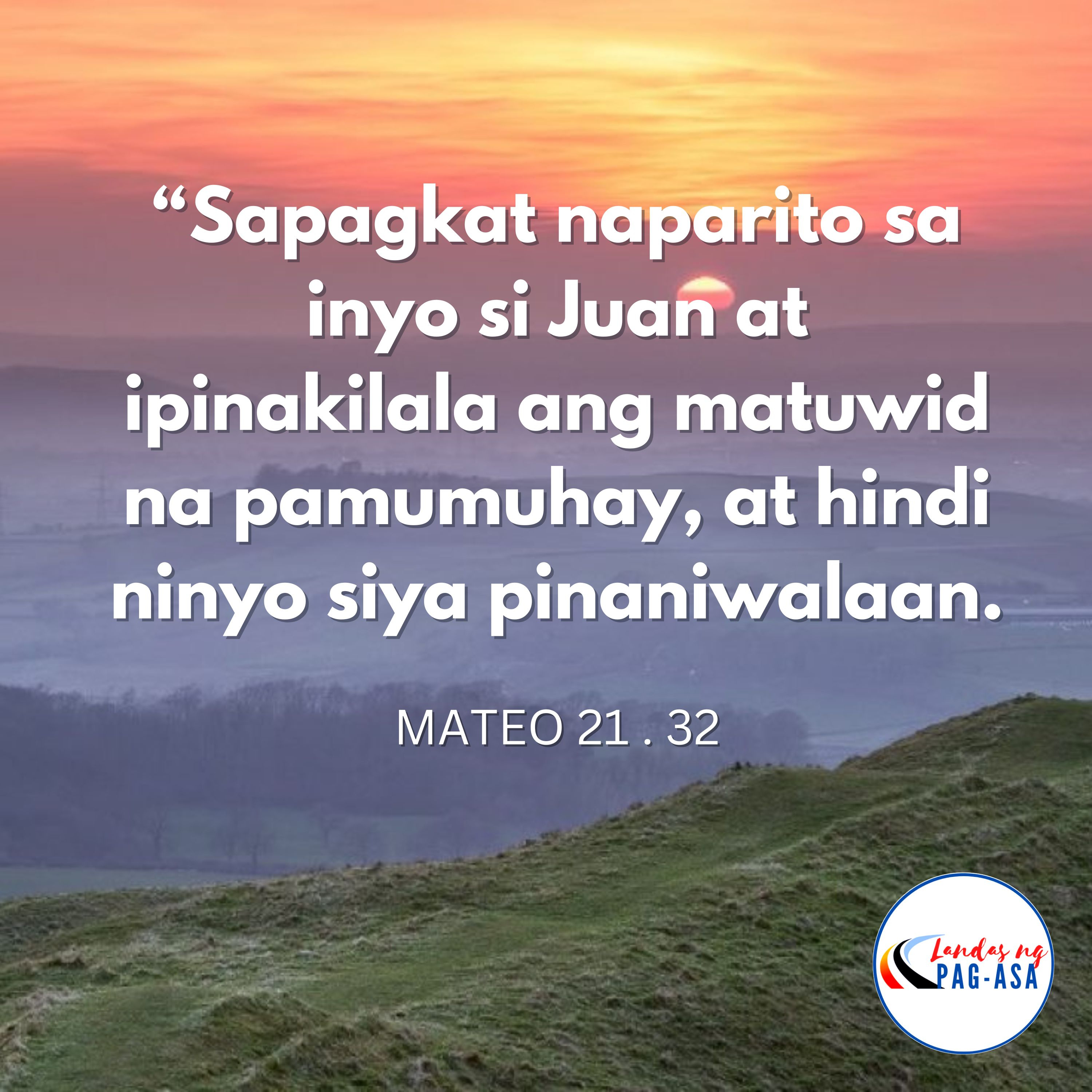 Noong panahong iyon, sinabi ni Hesus sa mga punong saserdote at mga matatanda ng bayan: “Ano ang palagay ninyo rito? May isang tao na may dalawang anak na lalaki. Lumapit siya sa nakatatanda at sinabi, ‘Anak, lumabas ka at magtrabaho sa ubasan ngayon.’ ‘Ayoko po.’ tugon niya. Ngunit nagbago ang kanyang isip at siya’y naparoon. Lumapit din ang ama sa ikalawa at gayun din ang kanyang sinabi. ‘Opo’ tugon nito, ngunit hindi naman naparoon. Sino sa dalawa ang sumunod sa kalooban ng kanyang ama?” “Ang nakatatanda po,” sagot nila. Sinabi sa kanila ni Hesus, “Sinasabi ko sa inyo: ang mga publikano at masasamang babae’y mauuna pa sa inyong pasakop sa paghahari ng Diyos. Sapagkat naparito sa inyo si Juan at ipinakilala ang matuwid na pamumuhay, at hindi ninyo siya pinaniwalaan. Ngunit pinaniwalaan siya ng mga publikano at ng masasamang babae. Nakita ninyo ito, subalit hindi pa rin kayo nagsisi at naniwala sa kanya.”
