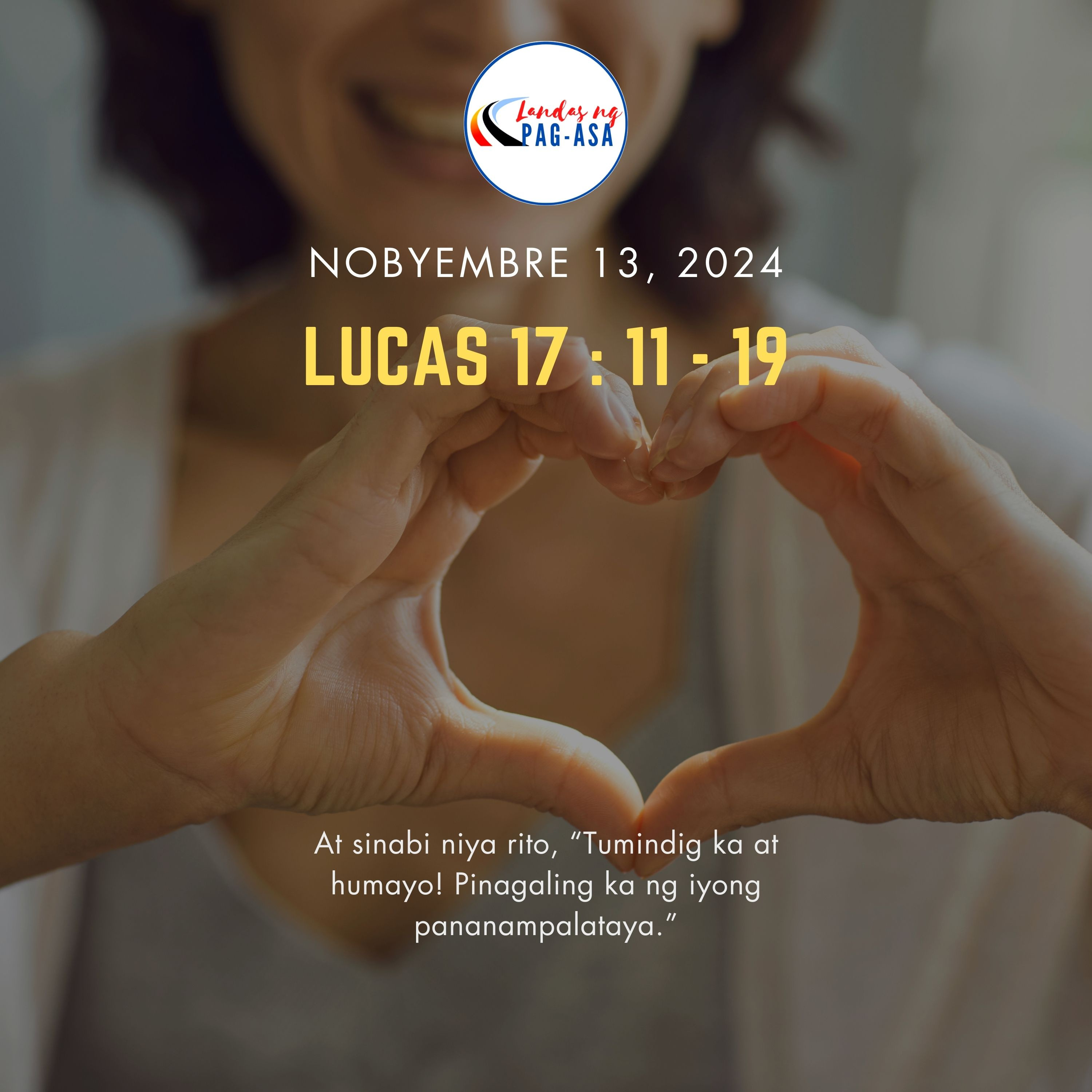Habang patungo sa Jerusalem, nagdaan si Jesus sa pagitan ng Samaria at Galilea. Pagpasok niya sa isang nayon, sinalubong siya ng sampung ketongin. Habang sila'y nakatayo sa malayo, sumigaw sila na nagsasabing, “Jesus! Panginoon! Maawa po kayo sa amin!” Nang makita sila ni Jesus ay sinabi niya, “Humayo kayo at magpasuri sa mga pari.” Habang sila'y naglalakad, silang lahat ay gumaling. Nang makita ng isa sa mga ito na gumaling na siya, bumalik siyang sumisigaw ng papuri sa Diyos. Nagpatirapa siya sa paanan ni Jesus. Ang lalaking ito ay Samaritano. Kaya't nagtanong si Jesus, “Hindi ba't sampu ang pinagaling? Nasaan ang siyam? Wala bang natagpuang bumalik upang magbigay ng papuri sa Diyos, maliban sa dayuhang ito?” At sinabi niya rito, “Tumindig ka at humayo! Pinagaling ka ng iyong pananampalataya.”