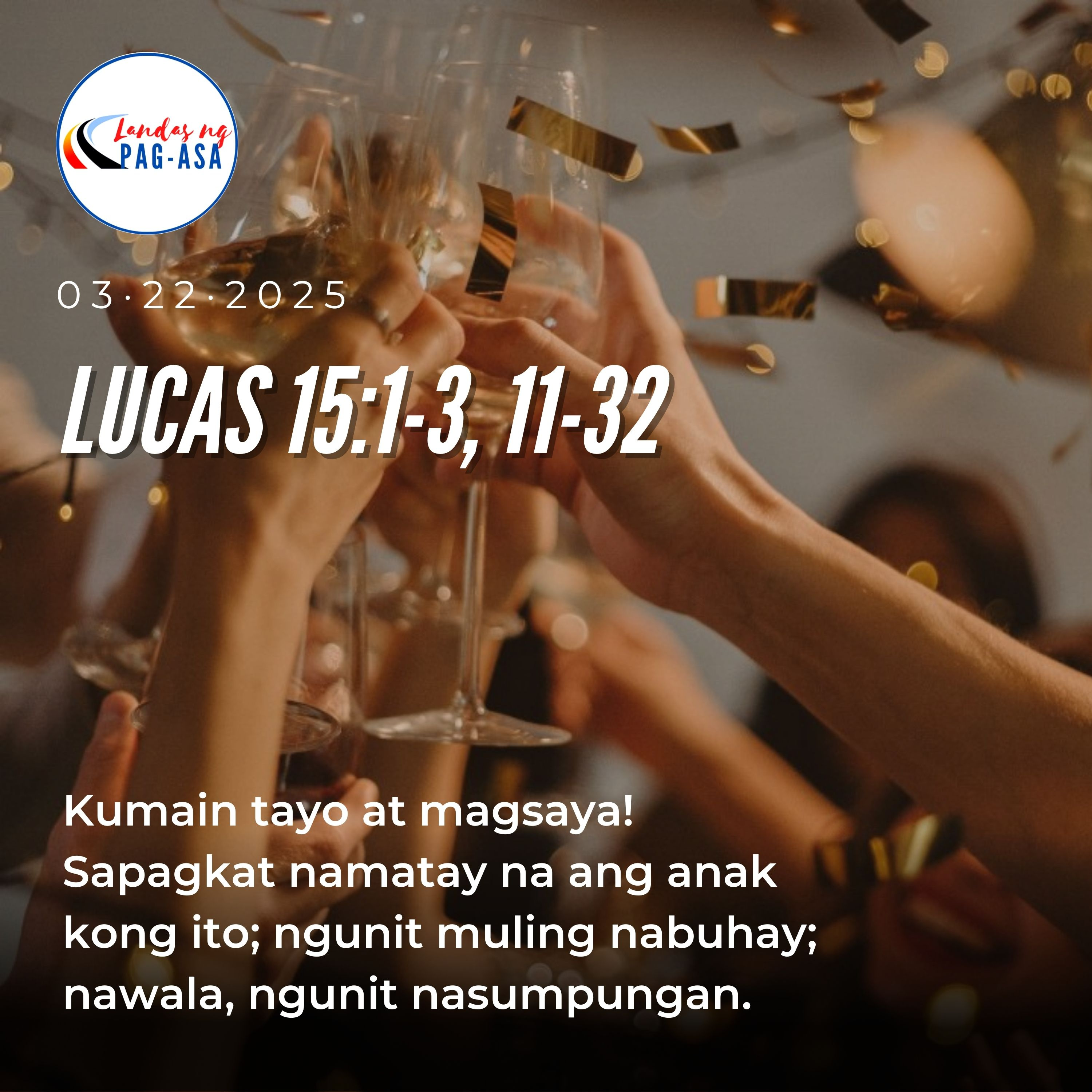 SABADO MARSO 22, 2025Sabado sa Ikalawang Linggo ng Apatnapung Araw na Paghahanda para sa Pasko ng Pagkabuhay Paggunita kay Santa Lea, baloMABUTING BALITA: LUCAS 15: 1-3, 11 - 32 Noong panahong iyon, ang mga publikano at ang mga makasalanan ay nagsisilapit upang makinig kay Hesus. Nagbulung-bulungan ang mga Pariseo at ang mga eskriba. Ang sabi nila: “Ang taong ito’y nakikisalamuha sa mga makasalanan at nakikisalo sa kanila.” Kaya’t sinabi sa kanila ni Hesus ang talinghagang ito:“Isang tao ang may dalawang anak na lalaki. Ang wika ng bunso, ‘Ama, ibigay na po ninyo sa akin ang mamanahin ko.’ At binahagi sa kanila ng ama ang kanyang ari-arian. Pagkalipas ng ilang araw, ipinagbili ng bunso ang kanyang ari-arian at nagtungo sa malayong lupain, taglay ang buo niyang kayamanan, at doo’y nilustay na lahat sa di wastong pamumuhay. Nang malustay na niya ang kanyang kayamanan, nagkaroon ng matinding taggutom sa lupaing yaon, at nagdalita siya. Kaya’t namasukan siya sa isang mamamayan ng lupaing yaon. Siya’y pinapunta nito sa bukid upang mag-alaga ng baboy. Ibig sana niyang punan ang kanyang pagkain kahit ng mga bungang-kahoy na ipinakakain sa mga baboy ngunit walang magbigay sa kanya. Nang mapag-isip-isip niya ang kanyang ginawa, nasabi niya sa sarili, ‘Ang mga alila ng aking ama ay may sapat na pagkain – at lumalabis pa – samantalang ako’y namamatay ng gutom dito! Babalik ako sa kanya, at sasabihin ko, “Ama, nagkasala po ako sa Diyos at sa inyo. Hindi na po ako karapat-dapat na tawagin ninyong anak; ibilang na lamang ninyo akong isa sa inyong mga alila.”, At tumindig siya at pumaroon sa kanyang ama.“Malayo pa’y natanawan na siya ng ama at ito’y labis na nahabag sa kanya, kaya’t patakbo siyang sinalubong, niyakap, at hinagkan. Sinabi ng anak, ‘Ama, nagkasala po ako sa Diyos at sa inyo. Hindi na po ako karapat-dapat na tawagin ninyong anak.’ Ngunit tinawag ng ama ang kanyang mga alila, ‘Madali! Dalhin ninyo rito ang pinakamahusay na damit at isuot sa kanya. Suutan siya ng singsing at panyapak. Kunin ang pinatabang guya at patayain; kumain tayo at magsaya! Sapagkat namatay na ang anak kong ito; ngunit muling nabuhay; nawala, ngunit nasumpungan.’ At sila’y nagsaya.“Nasa bukid noon ang anak na panganay. Umuwi siya, at nang malapit na sa bahay ay narinig niya ang tugtugan at sayawan. Tinawag niya ang isa sa mga alila at tinanong: ‘Bakit? May ano sa atin?’ ‘Dumating po ang inyong kapatid!’ tugon ng alila. ‘Ipinapatay ng inyong ama ang pinatabang guya, sapagkat nagbalik siyang buhay at walang sakit.’ Nagalit ang panganay at ayaw itong pumasok sa bahay. Kaya’t lumabas ang kanyang ama at inamu-amo siya. Ngunit sinabi nito, ‘Pinaglingkuran ko po kayo sa loob ng maraming taon, at kailanma’y hindi ko kayo sinuway. Ngunit ni minsa’y hindi ninyo ako binigyan ng kahit isang bisirong kambing para magkatuwaan kami ng aking mga kaibigan. Subalit nang dumating ang anak ninyong lumustay ng inyong kabuhayan sa masasamang babae, ipinagpatay pa ninyo ng pinatabang guya!’ Sumagot ang ama, ‘Anak, lagi kitang kapiling. Ang lahat ng ari-arian ko’y sa iyo. Ngunit dapat tayong magsaya at magalak, sapagkat namatay na ang kapatid mo, ngunit muling nabuhay; nawala, ngunit nasumpungan.’”Reflection by Lawrence Quintero : Missionary Development and Deployment Program Head of Couples for Christ #POHopegiver #LandasngPagasa #catholic #scriptures #bibleeadings #Jesus #CatholicChurch #christian #church #faith #god #jesuschrist #love #pray #bible #christianity #prayer #hope #gospel