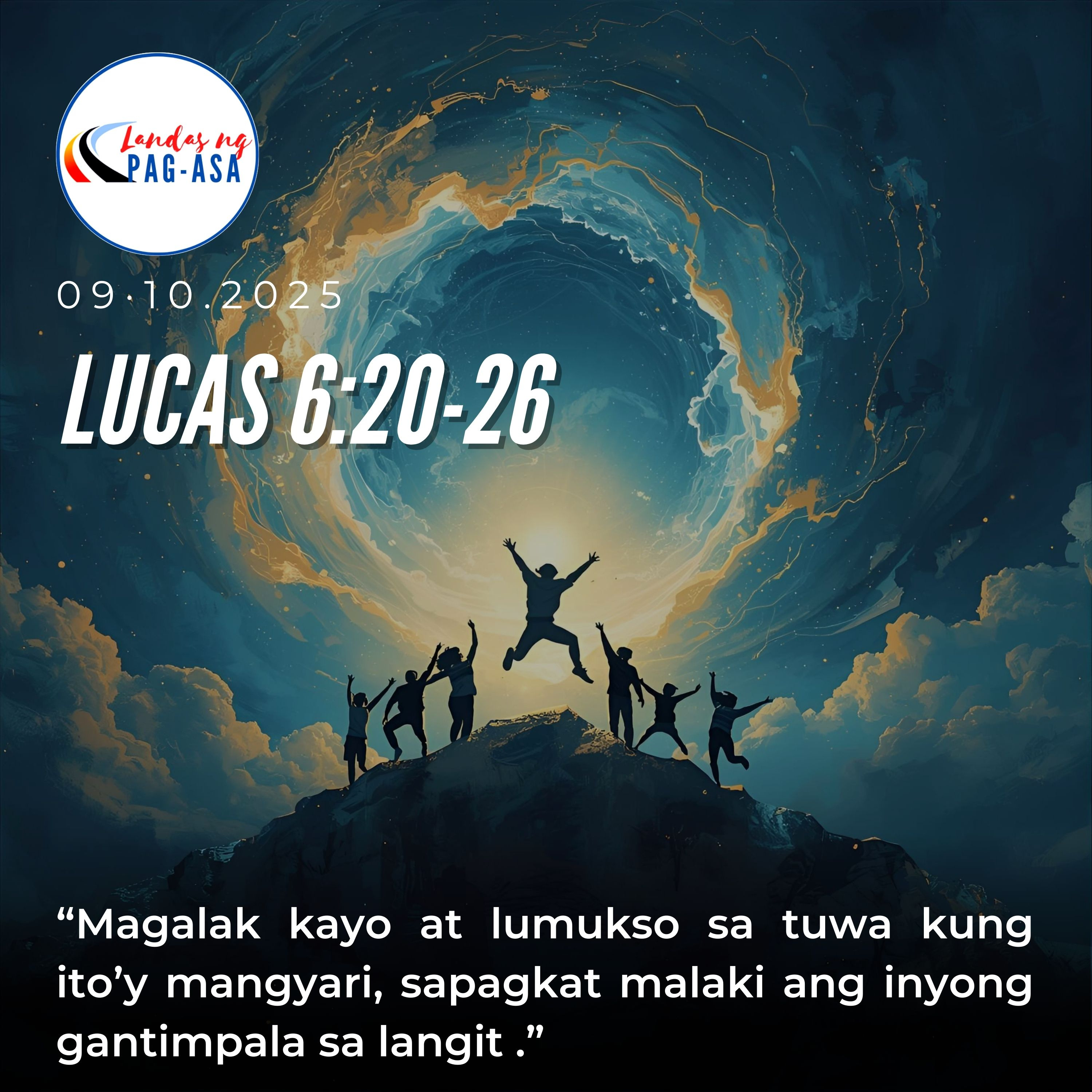 “Mapalad kayo kung dahil sa Anak ng Tao kayo’y kinapopootan, ipinagtatabuyan at inaalimura ng mga tao, at pati ang inyong pangalan ay kinasusuklaman. Magalak kayo at lumukso sa tuwa kung ito’y mangyari, sapagkat malaki ang inyong gantimpala sa langit — gayun din ang ginawa ng kanilang mga ninuno sa mga propeta.”