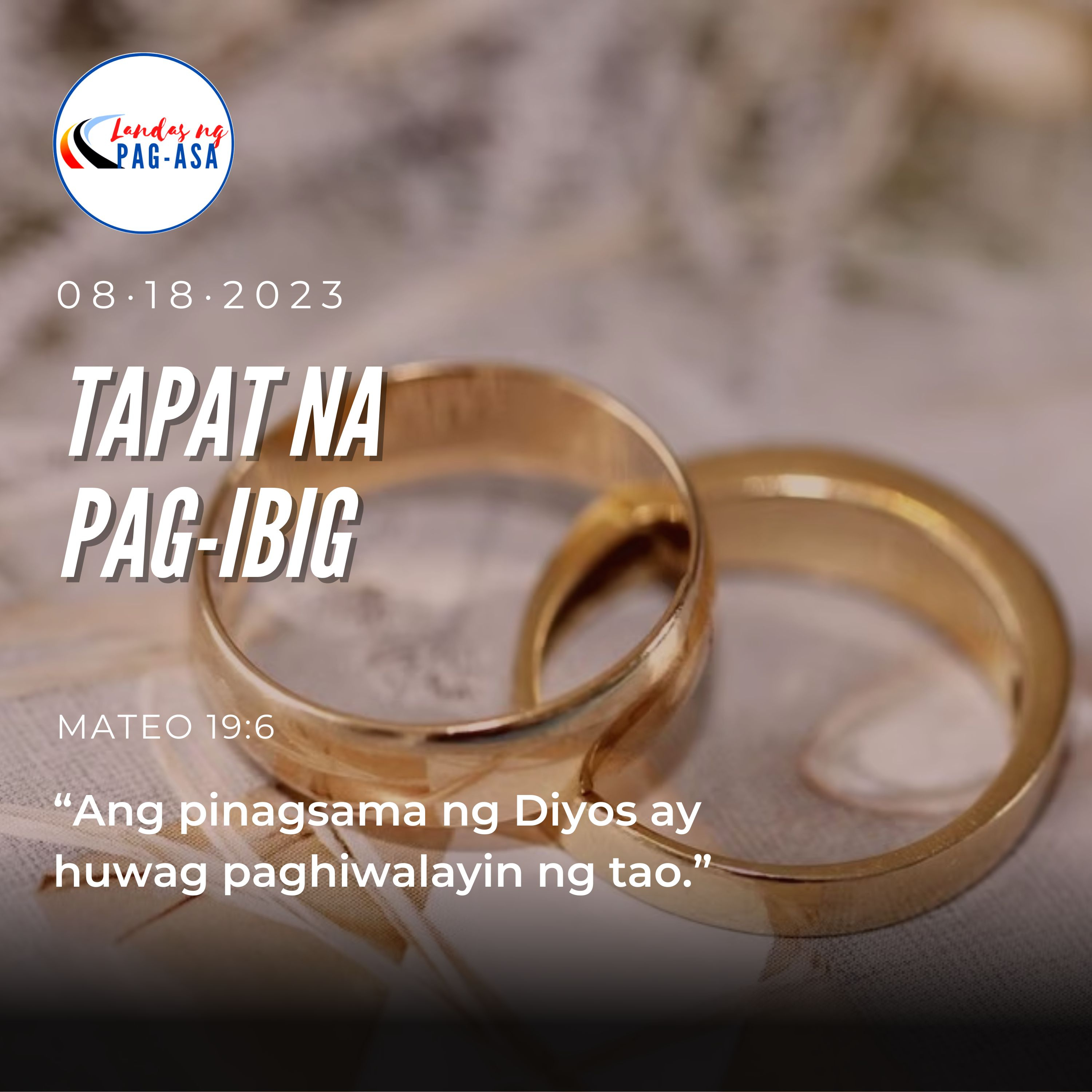Noong panahong iyon, may mga Pariseong lumapit kay Hesus at tinangkang siluin siya sa pamamagitan ng tanong na ito: “Naaayon ba sa Kautusan na hiwalayan ng lalaki ang kanyang asawa sa kahit anong kadahilanan?” Sumagot si Hesus, “Hindi pa ba ninyo nababasa sa Kasulutan na sa pasimula’y nilalang sila ng Maykapal, lalaki at babae? At sinabi, ‘Dahil dito, iiwan ng lalaki ang kanyang ama’t ina, at magsasama sila ng kanyang asawa; at sila’y magiging isa.’ Kaya’t hindi na sila dalawa kundi isa. Ang pinagsama ng Diyos ay huwag paghiwalayin ng tao.” Tinanong siya ng mga Pariseo, “Bakit iniutos ni Moises na bigyan ng lalaki ang kanyang asawa ng kasulatan sa paghihiwalay bago hiwalayan iyon?” Sumagot si Hesus, “Dahil sa katigasan ng inyong ulo kaya ipinahintulot ni Moises na hiwalayan ninyo ang inyong asawa. Subalit hindi gayun sa pasimula. Kaya sinasabi ko sa inyo: sinumang lalaking humiwalay sa kanyang asawa sa anumang dahilan liban sa pakikiapid, at mag-asawa sa iba, ay nangangalunya. At ang mag-asawa sa babaing hiniwalayan ay nangangalunya rin.”