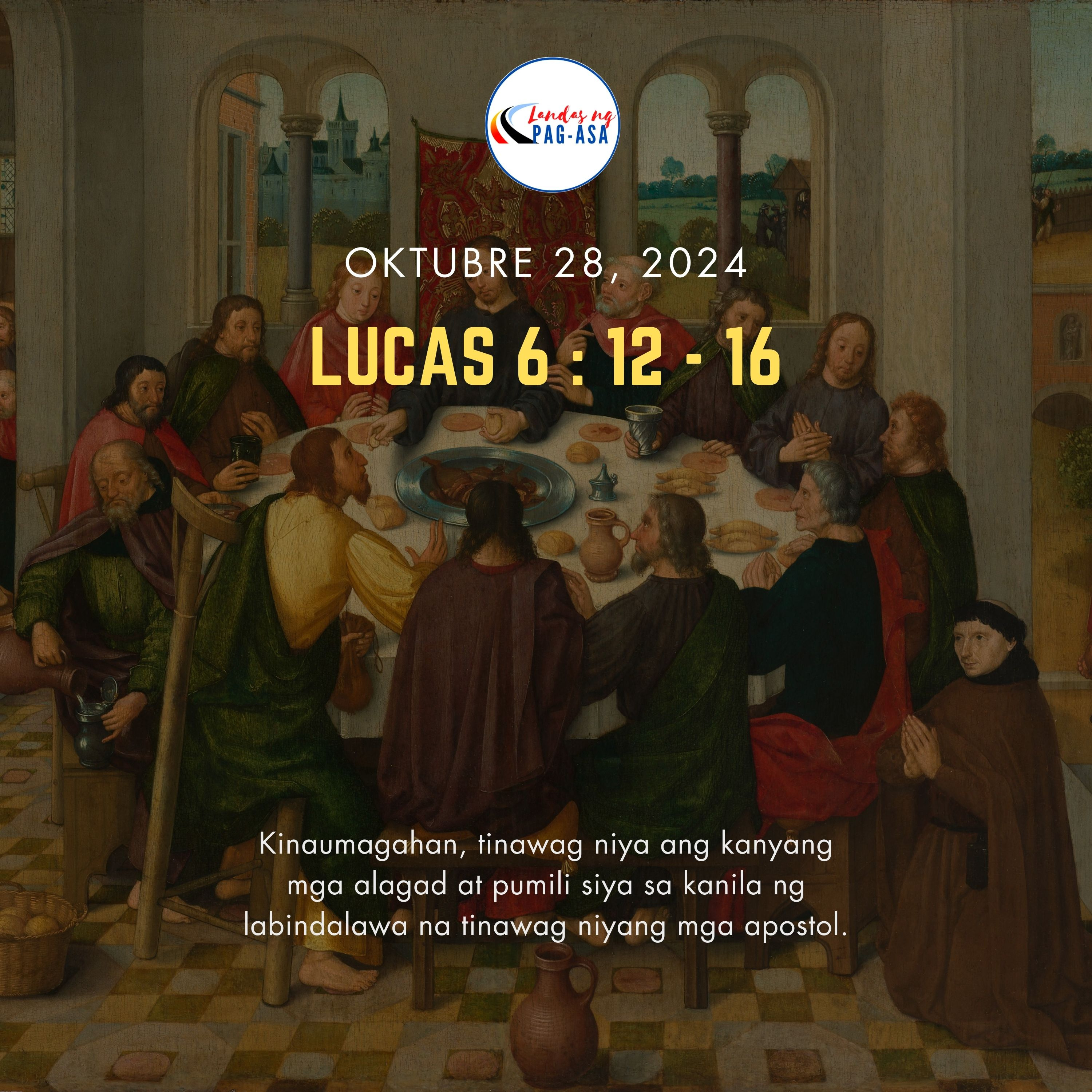 Nang mga araw na iyon, umakyat sa bundok si Jesus upang manalangin. Magdamag siyang nanalangin sa Diyos. Kinaumagahan, tinawag niya ang kanyang mga alagad at pumili siya sa kanila ng labindalawa na tinawag niyang mga apostol. Ang mga ito ay sina Simon na tinawag niyang Pedro, si Andres na kapatid nito; sina Santiago at Juan; sina Felipe, Bartolome, Mateo, at Tomas; si Santiago na anak ni Alfeo; si Simon na tinawag na Makabayan; si Judas na anak ni Santiago; at si Judas Iscariote, na naging taksil.
