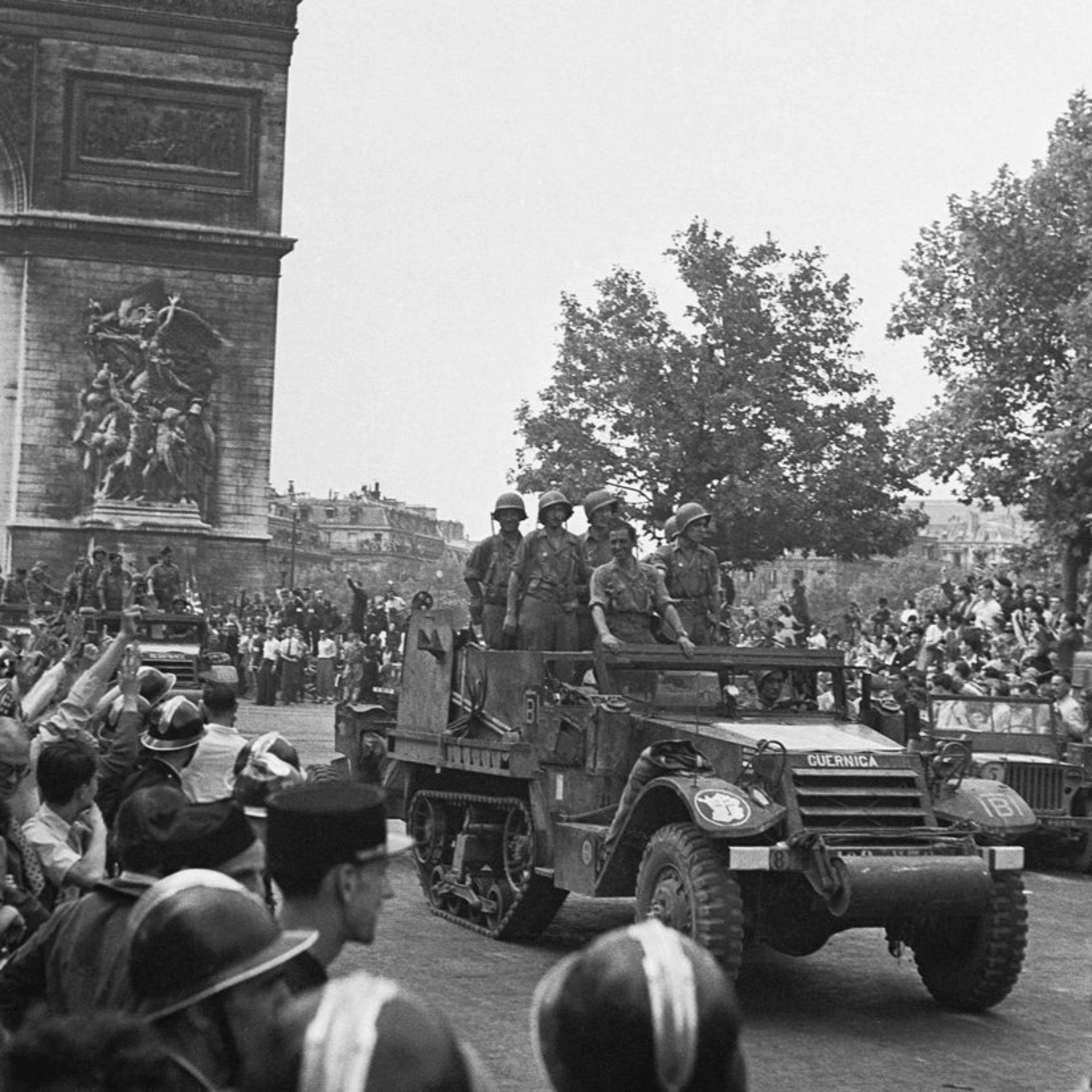 Illustration: Driving down the Champs Elysées of newly liberated Paris, with the Arc de Triomphe behind, on 26 August 1945, the halftrack ‘Guernica’ from the Ninth Company – La Nueve – manned by exiled republican veterans of Spain’s civil war, from Philippe Leclerc’s Deuxième DB. Public Domain