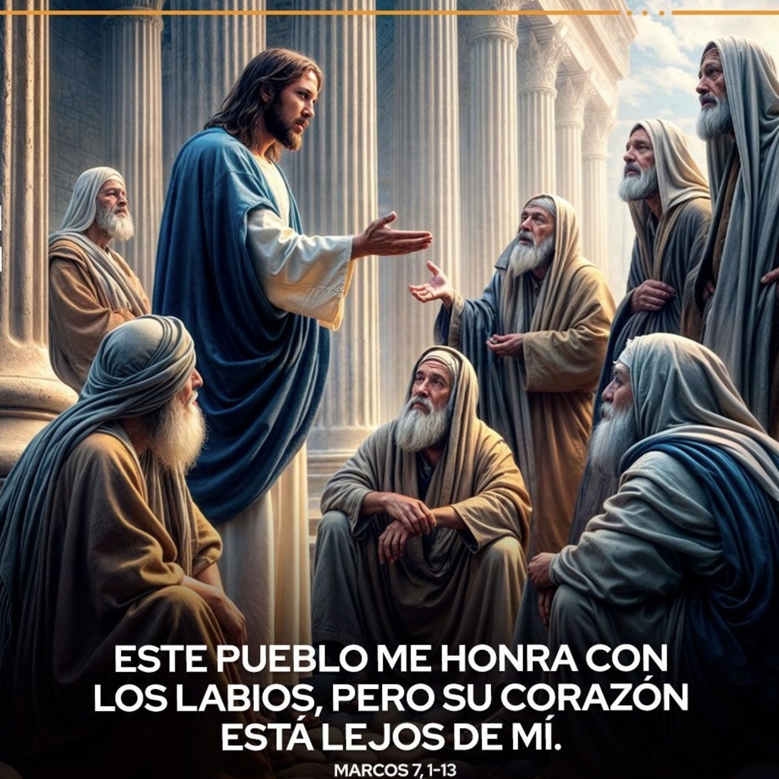 Jesús les contestó: "¡Qué bien profetizó Isaías sobre ustedes, hipócritas, cuando escribió: Este pueblo me honra con los labios, pero su corazón está lejos de mí. Es inútil el culto que me rinden, porque enseñan doctrinas que no son sino preceptos humanos. Ustedes dejan a un lado el mandamiento de Dios, para aferrarse a las tradiciones de los hombres".